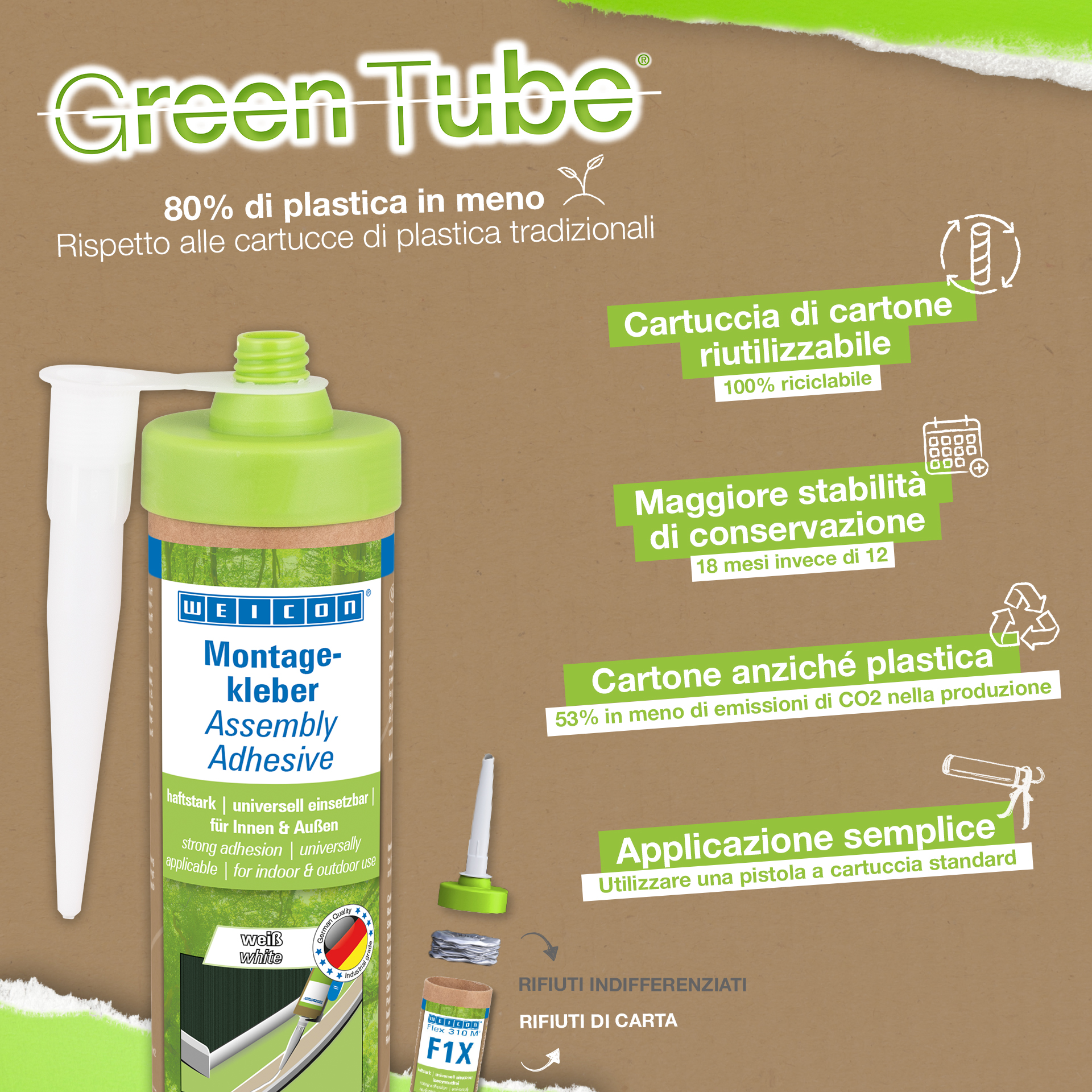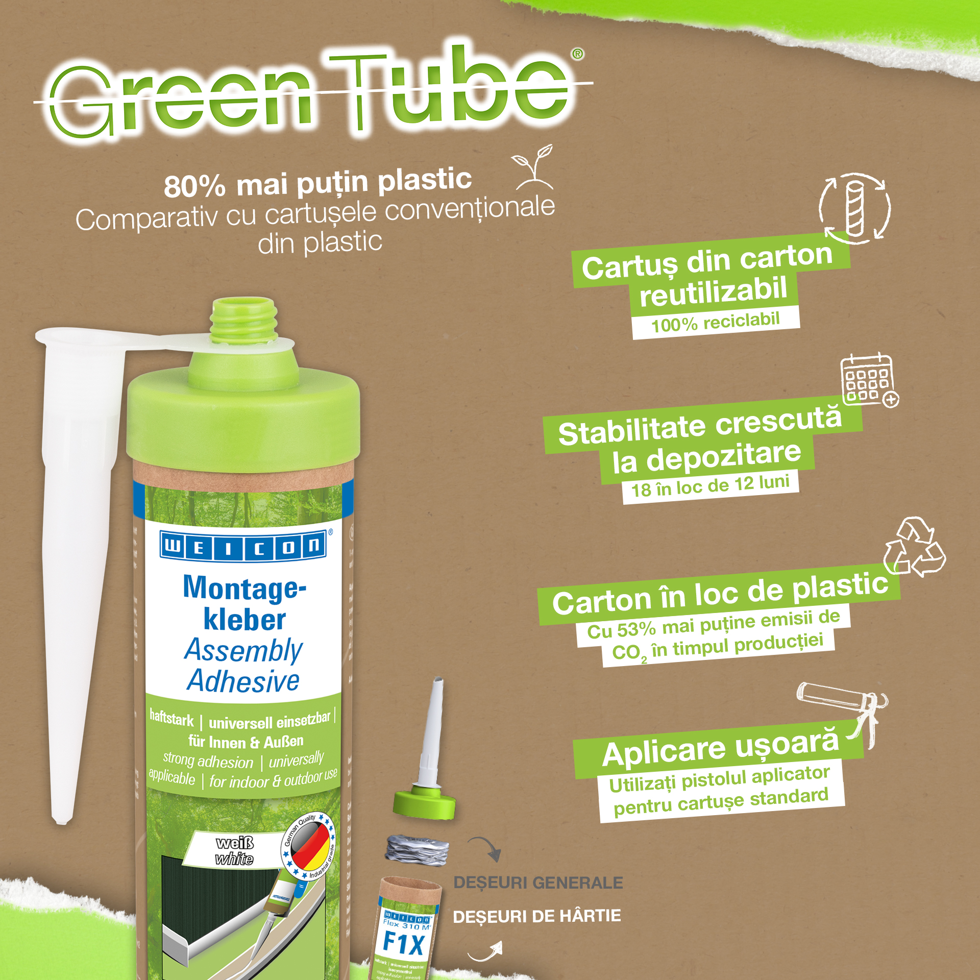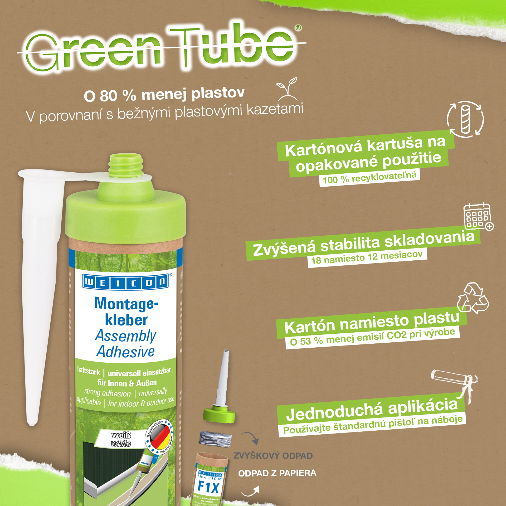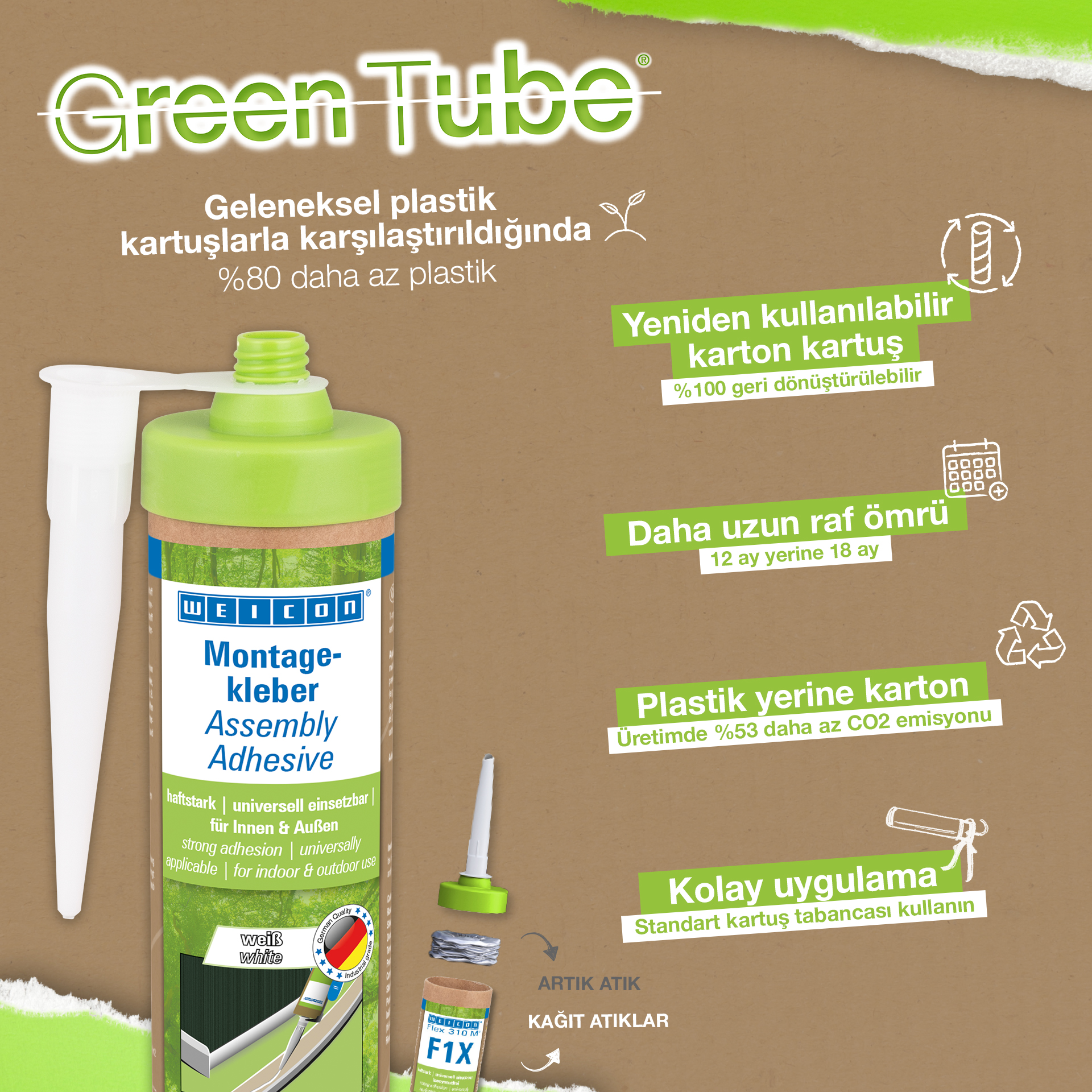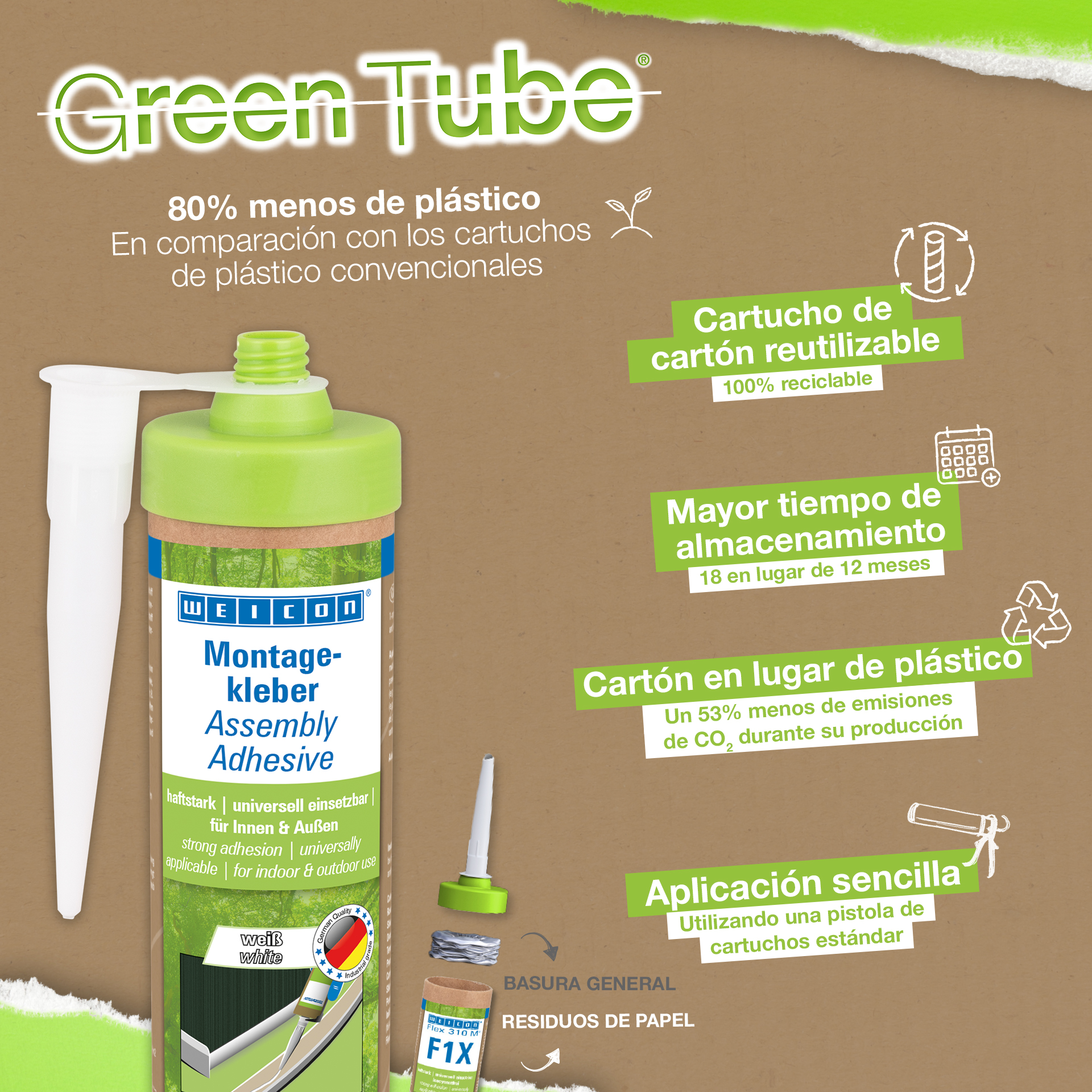 O WEICON Adesivo de Montagem é um adesivo acrílico de dispersão forte para trabalhos de montagem, reparação e retoque. O adesivo tem uma elevada aderência inicial e resistência final e cura rapidamente. Após a secagem, o adesivo de montagem pode ser lixado e rebocado e pode ser pintado com tintas e vernizes disponíveis no mercado. A cola é resistente a temperaturas entre -20°C e +80°C e é adequada para aplicações interiores e exteriores. O adesivo flexível branco é de baixa emissão e não contém solventes. O adesivo de montagem é universalmente aplicável e pode ser utilizado para uma grande variedade de aplicações. É ideal, por exemplo, para a colagem de superfícies de materiais à base de madeira (como rodapés, molduras decorativas, painéis ou placas de aglomerado), PVC, poliestireno, placas de espuma de poliestireno, espuma rígida de PU (por exemplo, placas de isolamento e condutas de cabos), materiais minerais (por exemplo, azulejos) e metais em substratos absorventes, como gesso, betão, fibrocimento, placas de gesso e madeira não tratada. Embalagem amiga do ambiente - o mesmo desempenho forte! Green Tube, a embalagem sustentável: a ponta e a tampa são feitas de plástico 100% reciclado, e o corpo do cartucho é feito inteiramente de cartão. Isto significa menos emissões de CO₂ e menor utilização de plástico em comparação com os cartuchos convencionais - tudo isto sem comprometer o desempenho!