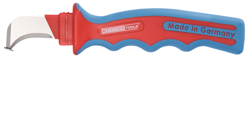 Live-line working up to 1000 volts I Fast slicing of multiply insulated cables I Protection of the conductors thanks to rounded blade tip I Good power transmission due to optimised handle shape I with 2-component handles for more safety I Blade made of Carbon steel - therefore easier to regrind I Sliding shoe welded to the tip of the blade
