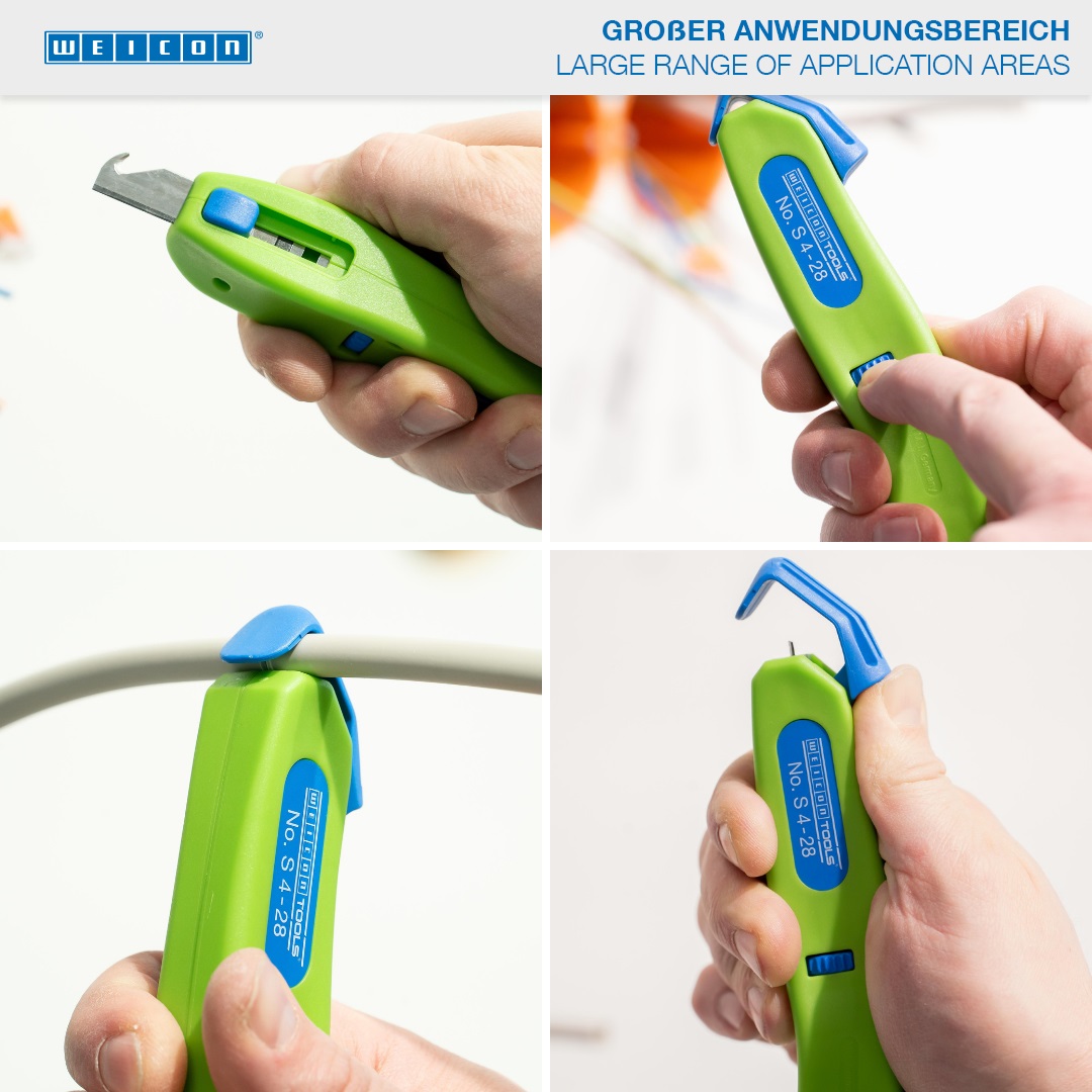 With the Green Line, a very special tool range has been developed. The tools are made of up to 97 % renewable raw materials, which is recyclable and has an excellent life cycle assessment. Working range 4 - 28 mm Ø, Completely ergonomic & fully insulated Infinitely variable and easy to operate adjusting wheel Precise, quick and safe stripping