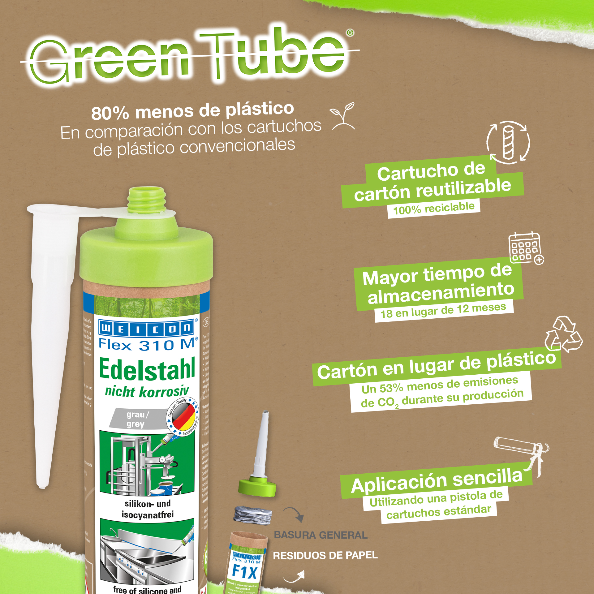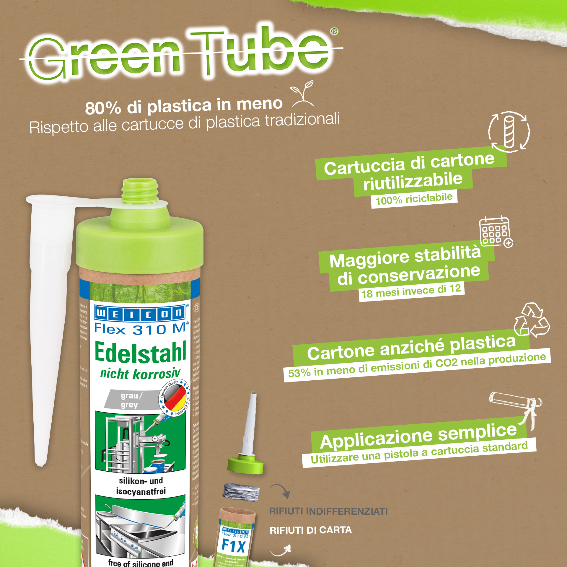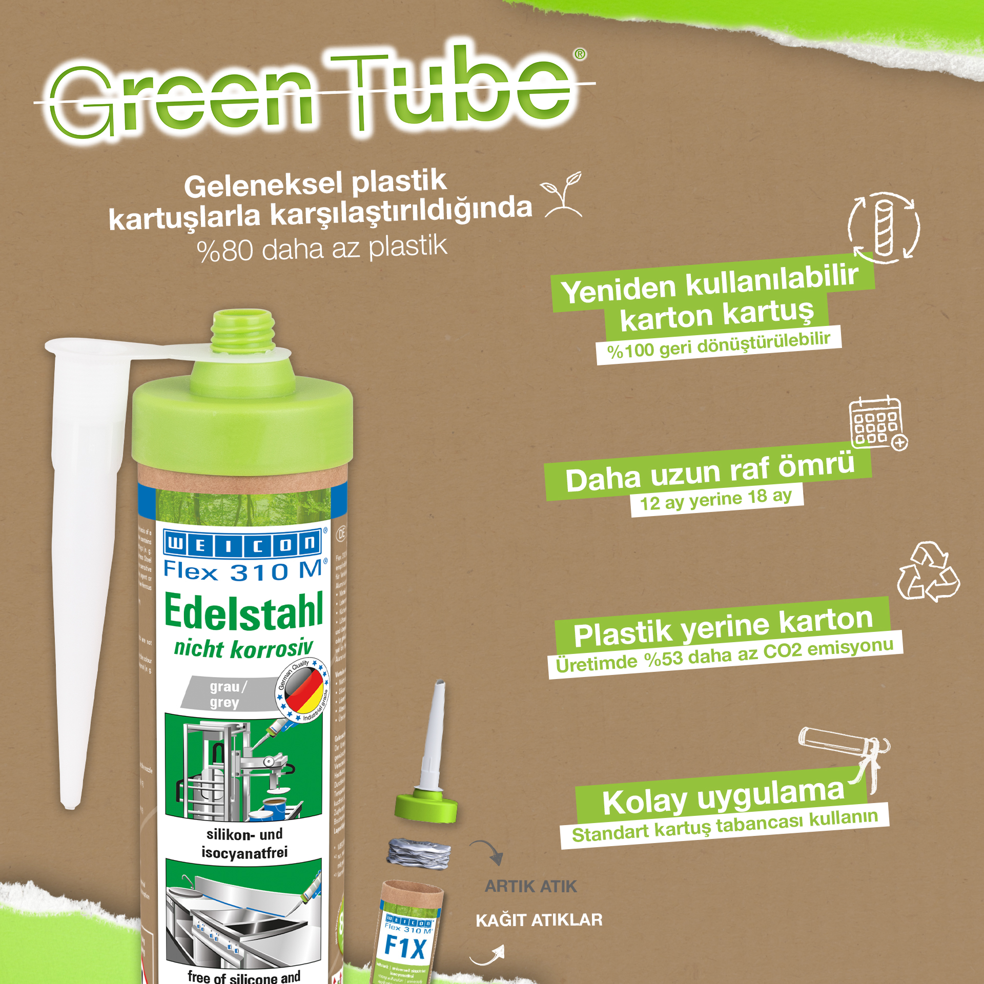 O Adesivo e Vedante WEICON Flex 310 M® Aço Inoxidável não é corrosivo, é forte, pode ser pintado (molhado sobre molhado), pode ser lixado, é resistente ao envelhecimento e à radiação UV e não contém silicone, isocianato, halogéneos ou solventes. O Flex 310 M® Aço Inoxidável é certificado pela ISEGA e pode ser utilizado como adesivo na tecnologia alimentar. O Flex 310 M® Aço Inoxidável é um adesivo elástico à base de polímero MS e é adequado para colagens, bem como para vedação de juntas e uniões em metais, tais como aço inoxidável, alumínio e metais não ferrosos. Também pode ser utilizado em todas as áreas de aplicação em que a cor do adesivo e do vedante deve corresponder ao material da superfície (por exemplo, aço inoxidável, alumínio, etc.). O WEICON Flex 310 M® Aço Inoxidável pode ser utilizado na construção metálica, na engenharia de tanques e aparelhos, na indústria alimentar, em cozinhas e instalações sanitárias, sistemas de ventilação e ar condicionado e em todas as aplicações em que os silicones ou produtos que contenham silicones não são adequados.