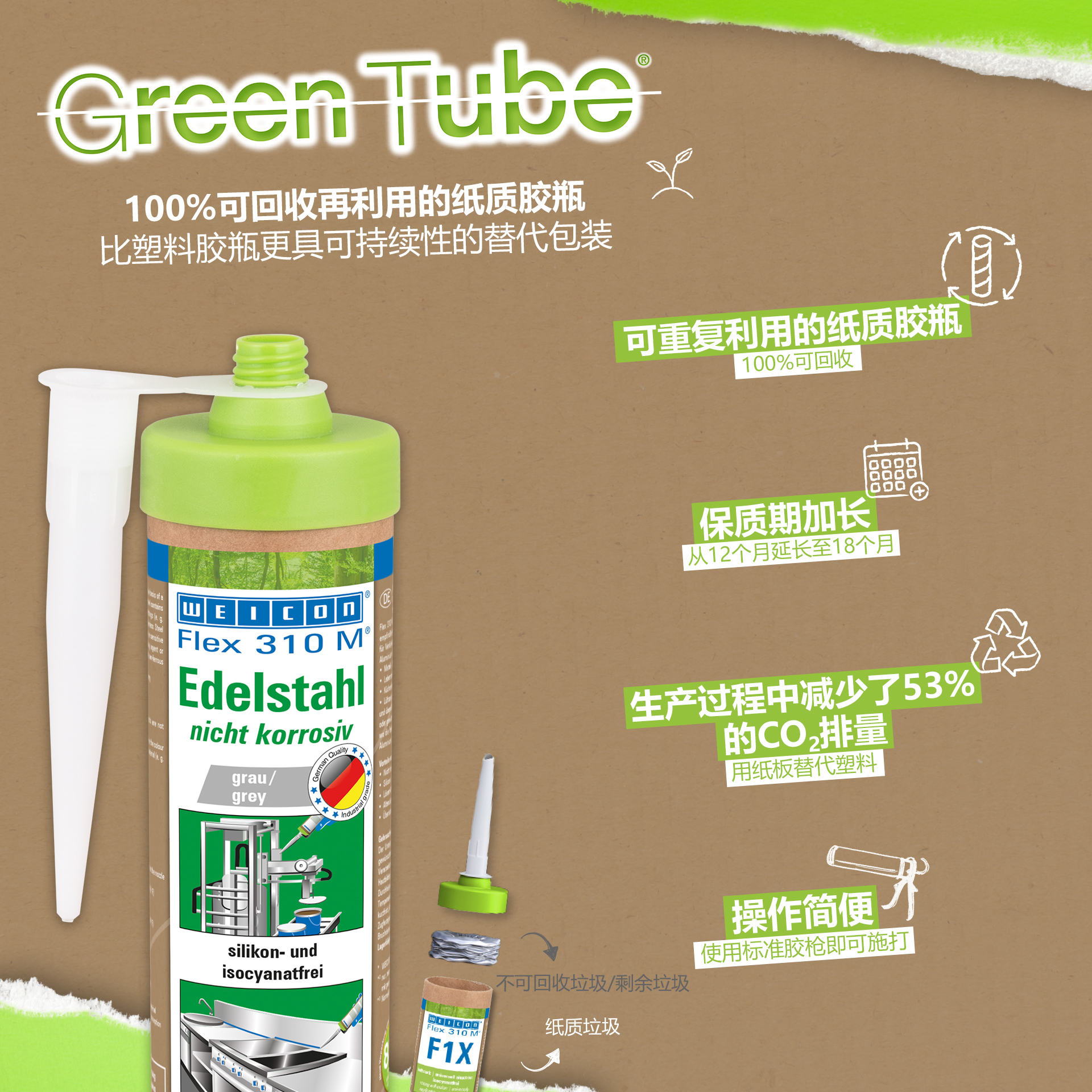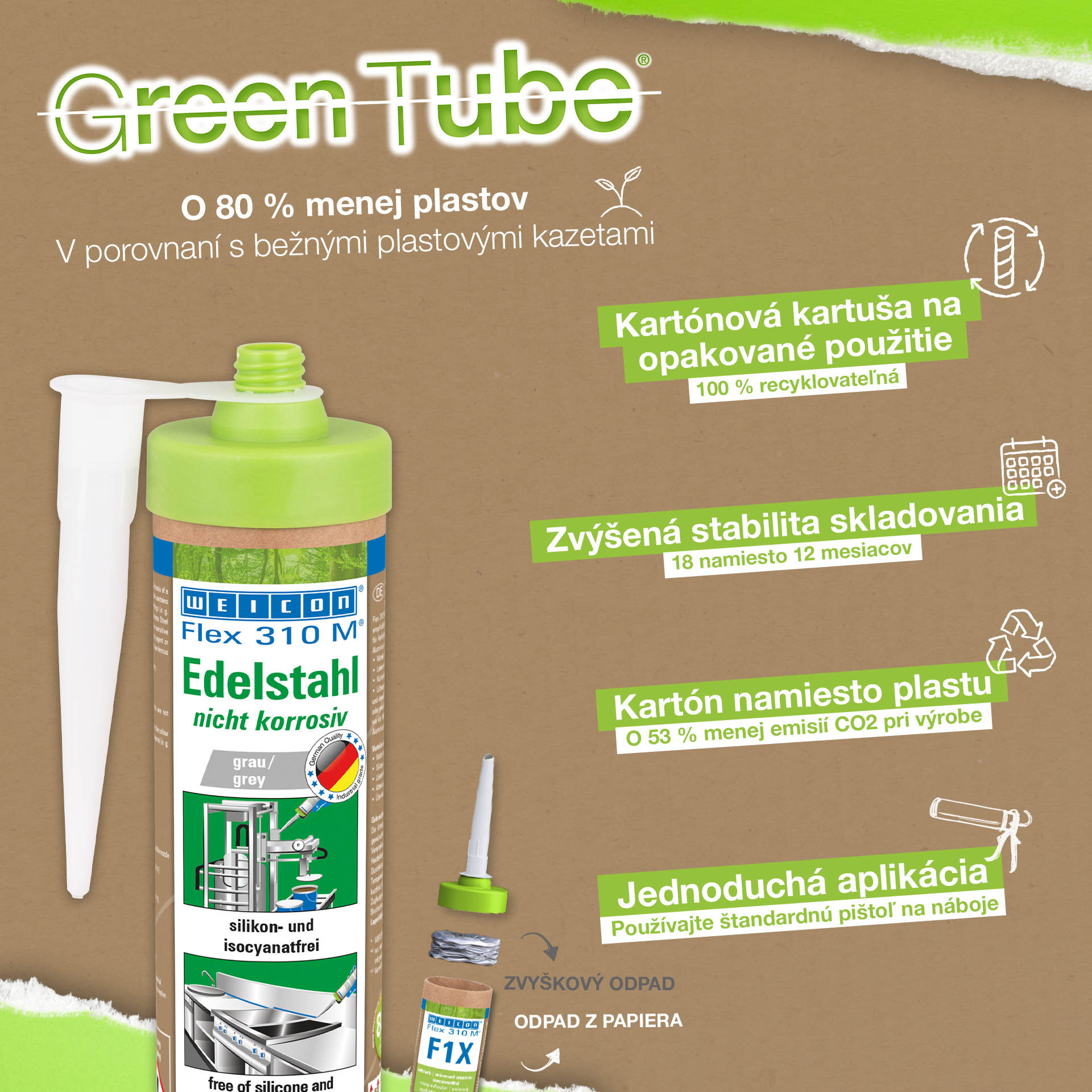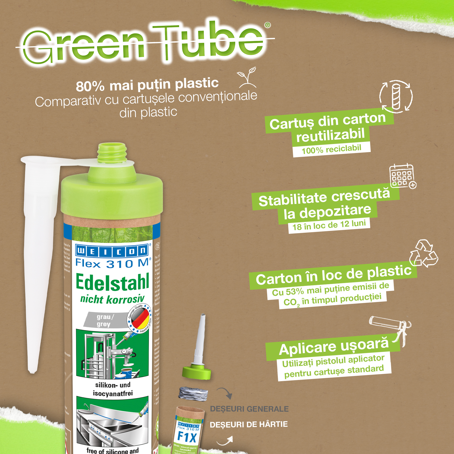 O Adesivo e Vedante WEICON Flex 310 M® Aço Inoxidável não é corrosivo, é forte, pode ser pintado (molhado sobre molhado), pode ser lixado, é resistente ao envelhecimento e à radiação UV e não contém silicone, isocianato, halogéneos ou solventes. O Flex 310 M® Aço Inoxidável é certificado pela ISEGA e pode ser utilizado como adesivo na tecnologia alimentar. O Flex 310 M® Aço Inoxidável é um adesivo elástico à base de polímero MS e é adequado para colagens, bem como para vedação de juntas e uniões em metais, tais como aço inoxidável, alumínio e metais não ferrosos. Também pode ser utilizado em todas as áreas de aplicação em que a cor do adesivo e do vedante deve corresponder ao material da superfície (por exemplo, aço inoxidável, alumínio, etc.). O WEICON Flex 310 M® Aço Inoxidável pode ser utilizado na construção metálica, na engenharia de tanques e aparelhos, na indústria alimentar, em cozinhas e instalações sanitárias, sistemas de ventilação e ar condicionado e em todas as aplicações em que os silicones ou produtos que contenham silicones não são adequados.