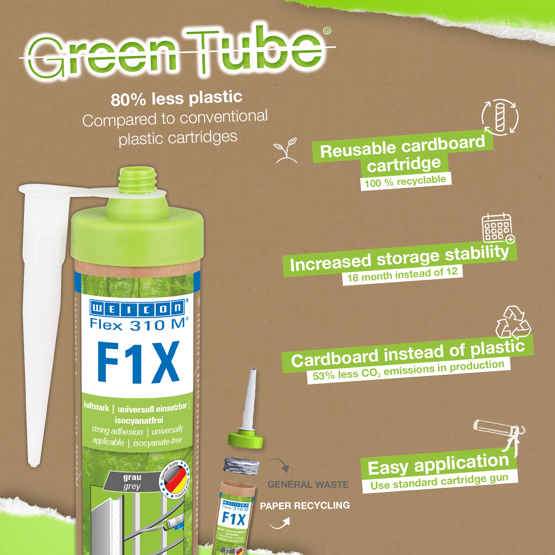 WEICON Flex 310 M® F1X Green Tube é um adesivo e vedante elástico à base de Polímero MS de cor cinzenta. É muito forte e universalmente adequado para fixar permanentemente quase todos os materiais a uma variedade de superfícies. Graças à sua elevada aderência inicial, a colagem é possível em superfícies verticais e mesmo por cima da cabeça, tanto em ambientes interiores como exteriores. Por exemplo, o Flex 310 M® F1X Green Tube pode ser utilizado para colar metais, muitos plásticos, cerâmica, madeira, vidro e pedra. O adesivo é permanentemente elástico e pode ser pintado “molhado sobre molhado”, é lixável, resistente às intempéries, à humidade, ao envelhecimento, ao bolor e aos raios UV. Resiste temporariamente (até 30 minutos) a temperaturas até +180°C e pode ser revestido a pó após um período de cura de quatro dias. Este adesivo e vedante não contém silicone, isocianatos, halogéneos e solventes e não é corrosivo. Flex 310 M® F1X Green Tube pode ser utilizado para a fixação de rodapés, painéis acústicos, faixas, molduras, painéis, tábuas, ladrilhos, pedras e películas de EPDM. Pode ser utilizado na construção de paredes de gesso e construções interiores, na construção metálica, na construção de tanques e aparelhos, na construção de contentores, na tecnologia de ventilação e ar condicionado, na construção de feiras e lojas, na construção de iates e barcos e em todos os locais onde os silicones ou produtos que contenham silicone não sejam adequados. Embalagem amiga do ambiente - o mesmo desempenho forte! Green Tube, a embalagem sustentável: a ponta e a tampa são feitas de plástico 100% reciclado, e o corpo do cartucho é feito inteiramente de cartão. Isto significa menos emissões de CO₂ e menor utilização de plástico em comparação com os cartuchos convencionais - tudo isto sem comprometer o desempenho!