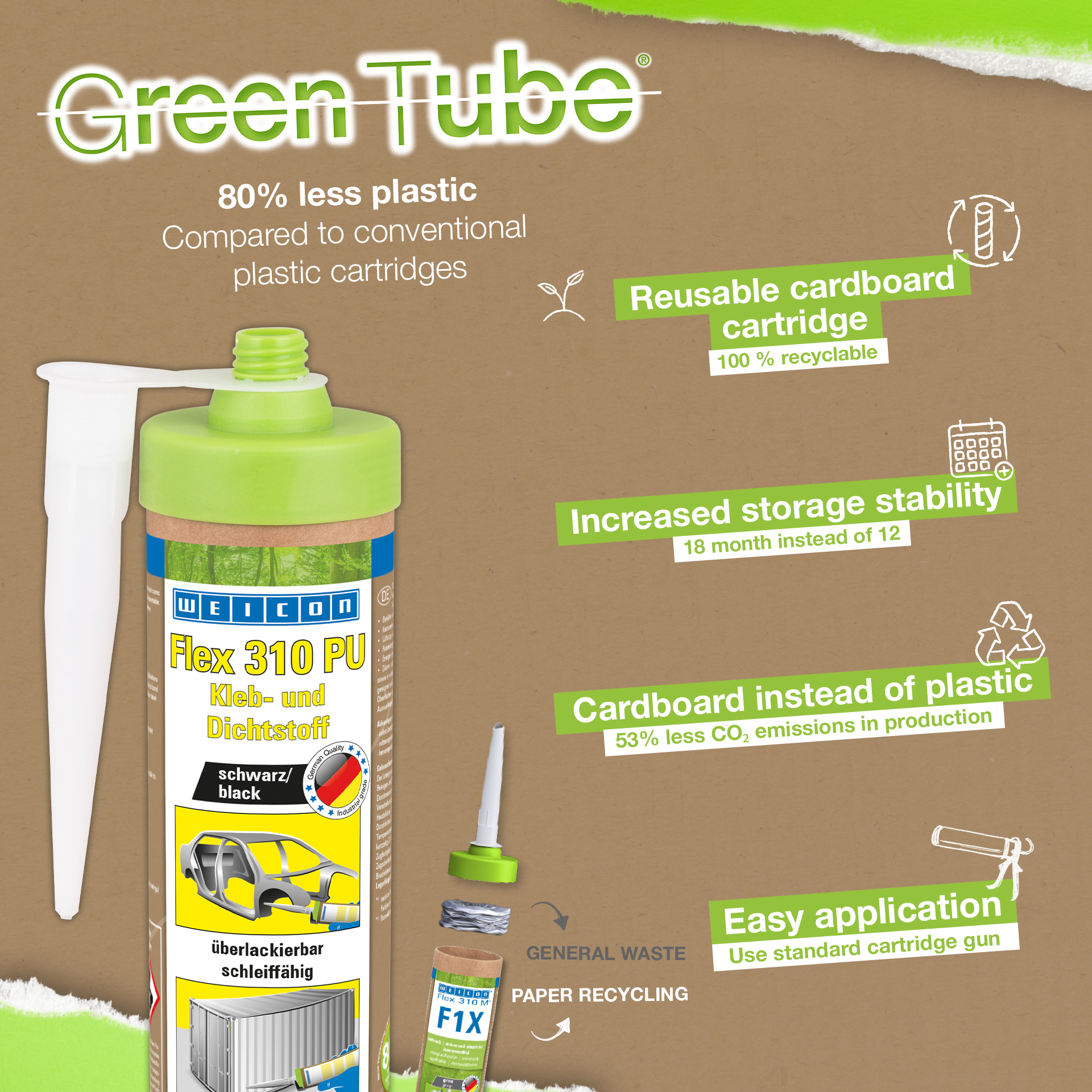 O WEICON Flex 310 PU é permanentemente elástico, forte, pintável, resistente às intempéries, ao envelhecimento, à água doce e à água do mar e isento de silicone. Este versátil adesivo e vedante à base de poliuretano (PUR) pode ser utilizado para a colagem e vedação de inúmeros materiais, tais como metais, plásticos, cerâmica, madeira, vidro e pedra. Pode ser utilizado na engenharia de tanques e aparelhos, na construção de carruagens, contentores e veículos, em sistemas de ventilação e de ar condicionado, na indústria energética e eléctrica e em todas as aplicações em que os silicones ou os produtos que contêm silicones não são adequados.