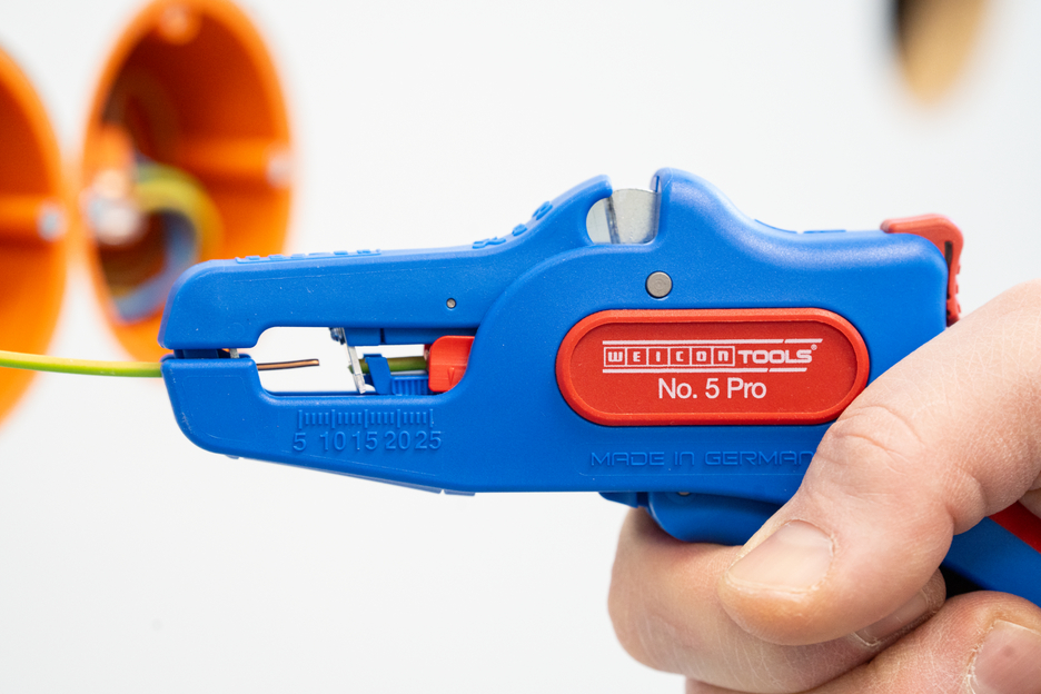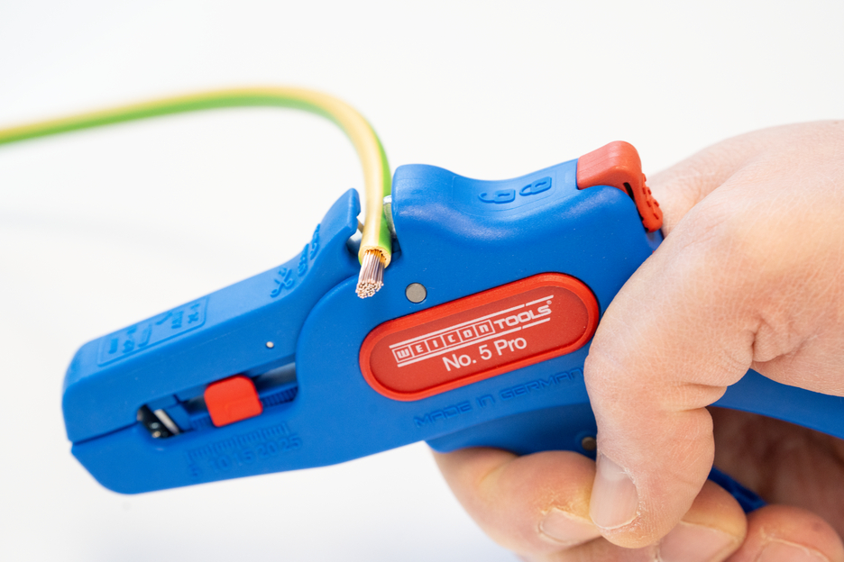 The automatic wire stripper can be used for stripping all common stranded and solid conductors from 0.2 to 16 mm². An adjustable length stop from 5 to 25 mm enables very precise and accurate working. The length stop can be removed, if required. The wire stripper automatically to adjusts to the required conductor cross-section – so no manual adjustment is necessary. The stripping tool features an integrated side cutter, which is suitable for conductors made of copper and aluminium up to a diameter of three millimetres. Thanks to slim design of the tool, the stripper can also be used in working areas that are difficult to access, such as in switch cabinets. The mechanics of the stripping tool are very smooth-running and have proven to be durable and reliable in numerous tests. The wire stripper has a non-slip multi-component handle in the blue-red "Ice Crack" design. The wire stripper has an eyelet to attach a strap for fall protection and is equipped with a labelling surface to be able to individualise the tool. In addition, the tool has a locking mechanism for space-saving storage.