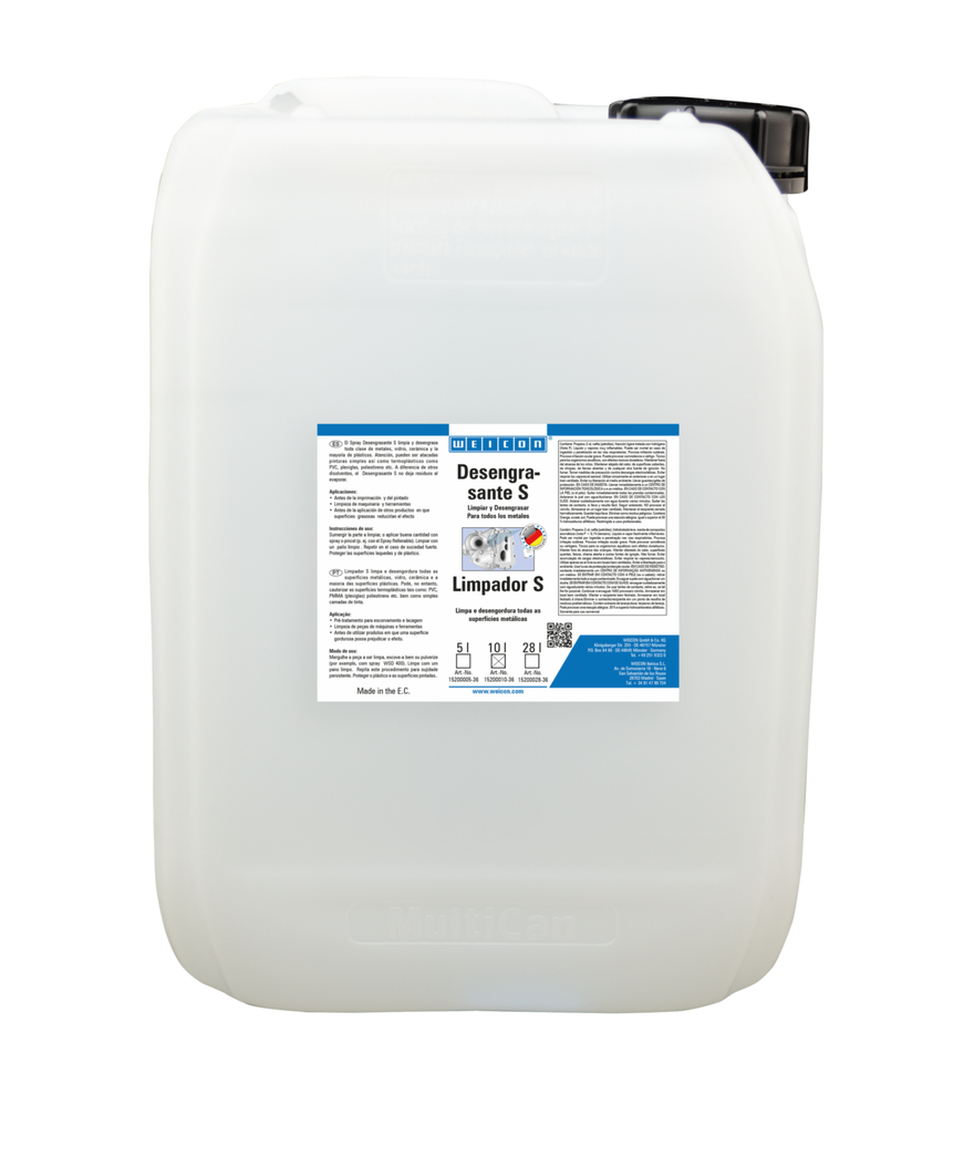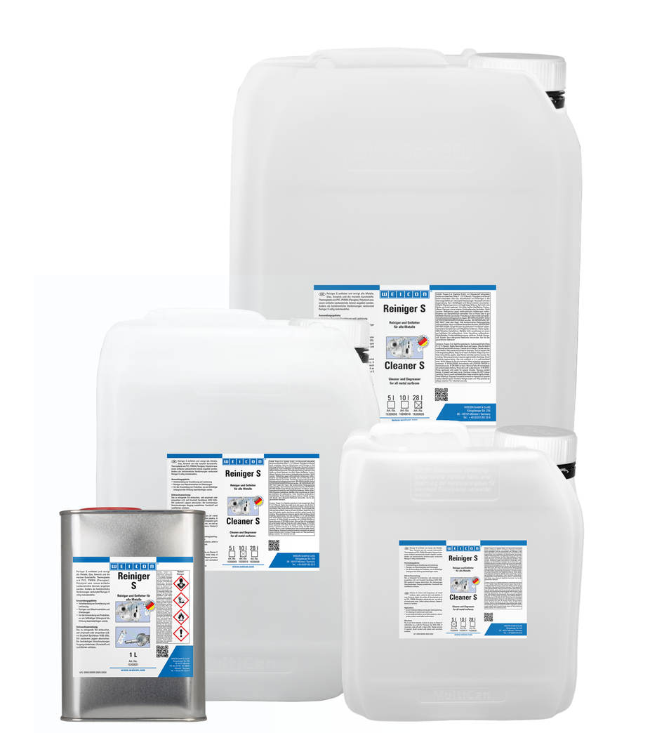 O Líquido de Limpeza S WEICON remove a sujidade oleosa e gordurosa de todos os metais, bem como da cerâmica, do vidro e da maioria dos plásticos. Pode, no entanto, atacar a superfície de termoplásticos como PVC, Plexiglas, poliestireno e camadas individuais de tinta. O Líquido de Limpeza S evapora rapidamente e, ao contrário dos diluentes convencionais, sem deixar resíduos. Pode ser utilizado para a limpeza e desengorduramento antes da aplicação de primários e pinturas, para a limpeza de peças de máquinas ou antes da aplicação de outros produtos WEICON em superfícies onde um fundo gorduroso prejudicaria o seu efeito.