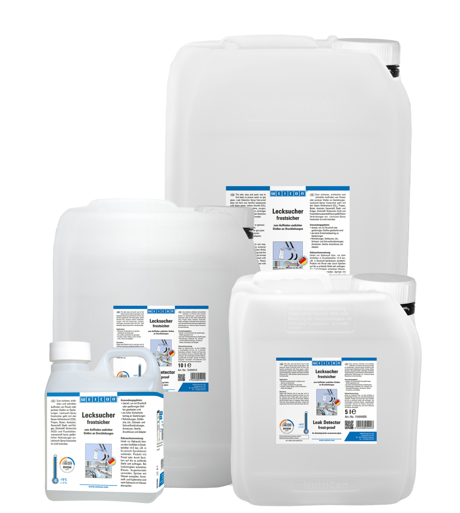 O Líquido Detetor de Fugas Anti-Congelante WEICON é perfeito para a localização rápida, confortável e fiável de fissuras ou partes porosas em tubos pressurizados. O Líquido Detetor de Fugas Anti-Congelante não forma compostos nocivos com estes gases: dióxido de carbono (CO2), propano, butano, acetileno, oxigénio, carvão e gás natural, nitrogénio, óxido nitroso (N2O) e clorofluorocarbonetos (CFC). Não é inflamável. O Líquido Detetor de Fugas Anti-Congelante é adequado para todos os locais onde se utiliza ar comprimido ou substâncias gasosas, por exemplo, em tubos, mangueiras, acessórios de inserção, ligações roscadas e soldadas, válvulas e adaptadores.