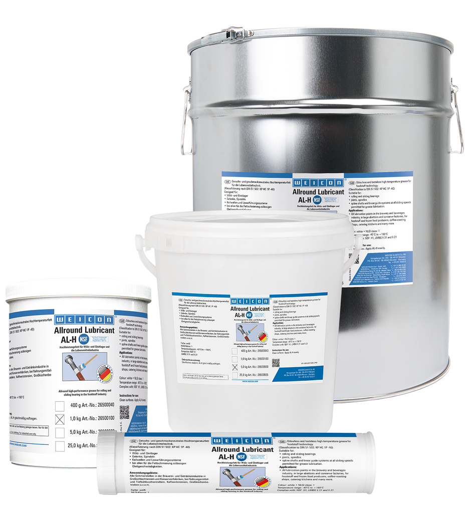 O WEICON AL-H é adequado para chumaceiras de rolos e de deslizamento, juntas, fusos, veios estriados e sistemas de guias lineares em todas as velocidades de deslizamento permitidas para lubrificação com massa. Graças à sua formula especial e à aprovação NSF H1, o AL-H é especialmente adequado para utilização na tecnologia de processamento de alimentos.