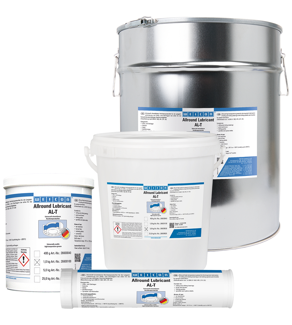 O WEICON AL-T é adequado para chumaceiras de rolos e de deslizamento, juntas, alavancas, guias de deslizamento, fusos, veios estriados e em todas as velocidades de deslizamento permitidas para a lubrificação com massa. O AL-T pode ser utilizado em muitas áreas industriais diferentes.