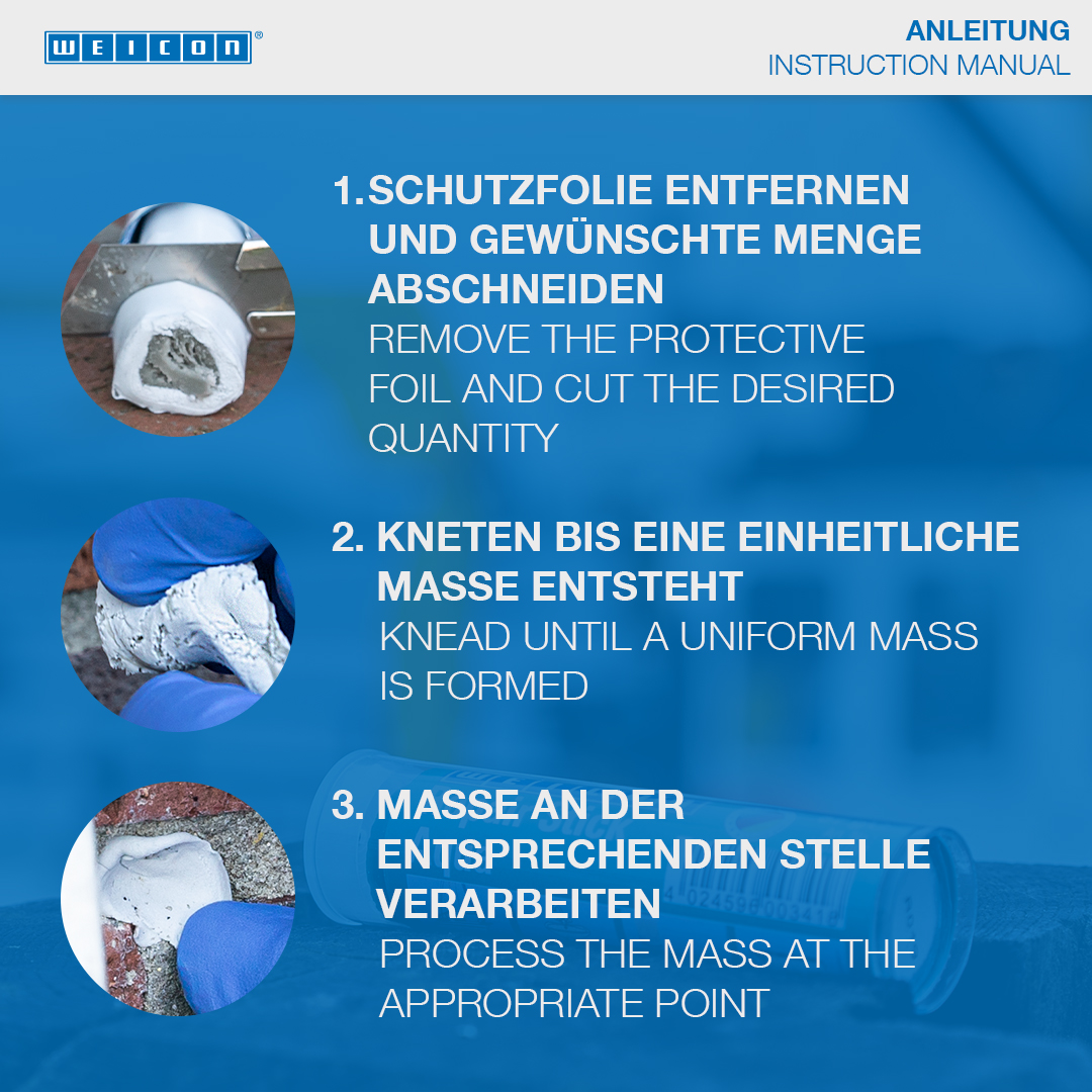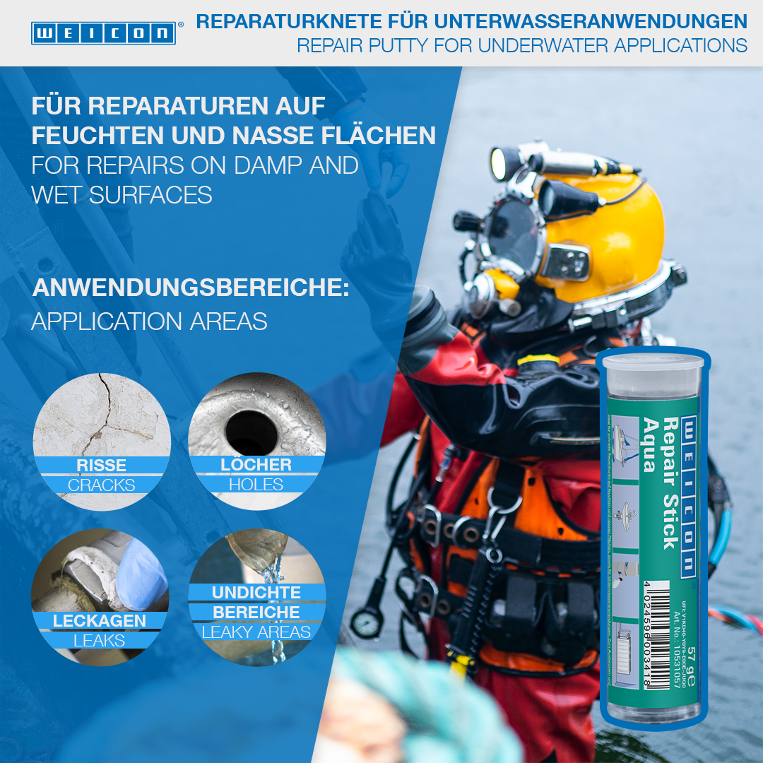 Ideal para reparações rápidas em superfícies húmidas e molhadas,bem como aplicações por baixo de água. Para retocar e vedar fissuras, furos, derrames e fugas em tanques de gasolina e de água, radiadores, aparelhos de comutação elétricos, instalações sanitárias e piscinas. A WEICON Massa Reparadora Água pode ser aplicada na construção de produtos sanitários e radiadores, no setor elétrico, no domínio marítimo bem como em muitos outros setores da indústria.
