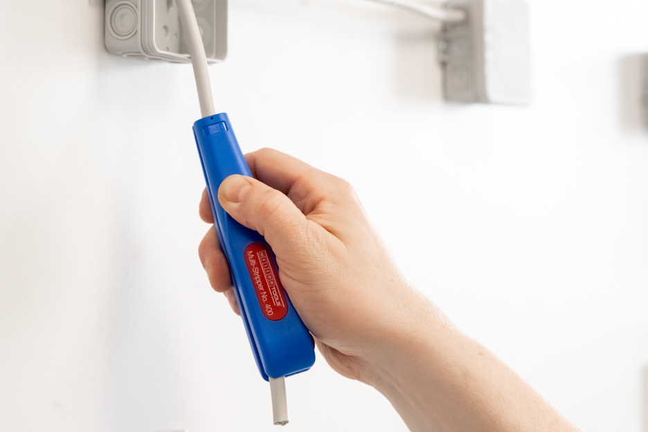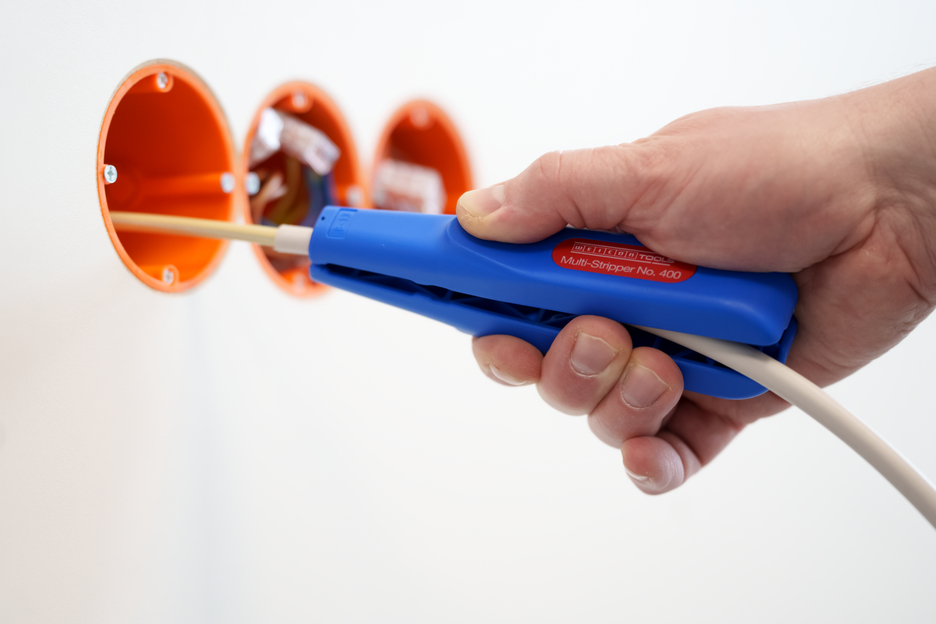 WEICON Multi-Stripper No. 400, a universal stripping tool for the functions: circular cutting - longitudinal cutting - stripping - cutting. With this tool, cables can be stripped easily even in places that are difficult to access, e.g. in ceilings and walls, in junction and distribution boxes, switch cabinets. The contour blade can be used to strip the conductor cross-sections 0.5 mm², 0.75 mm², 1.5 mm², 2.5 mm², 4.0 mm² and 6.0 mm². The multi-stripper impresses with its handy design and wide range of uses.