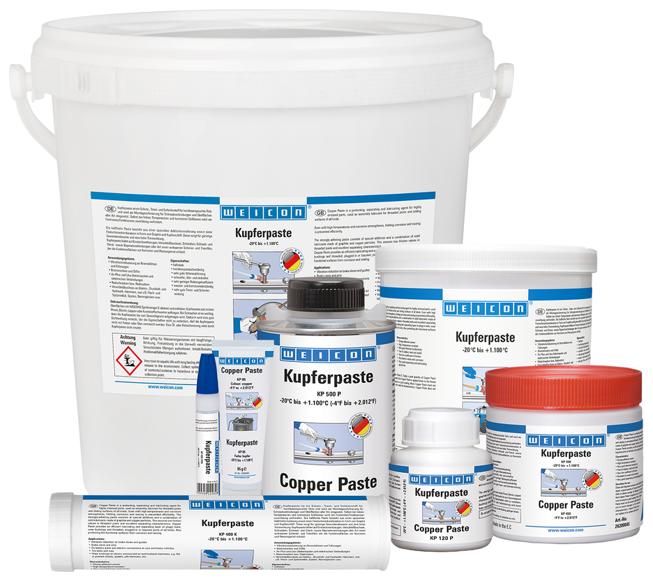 A WEICON Pasta de Cobre é um produto de proteção, desmoldante e lubrificante, resistente a temperaturas elevadas e à corrosão. A pasta apresenta aderência elevada e é livre de enxofre, chumbo e níquel. A Pasta de Cobre é utilizada como lubrificante de montagem para todo o tipo uniões roscadas e superfícies deslizantes. Esta pasta forma uma película lubrificante e desmoldante eficaz em ferramentas de encaixe, buchas de desgaste, parafusos, uniões roscadas, conetores e ligações tipo baioneta, que protege as áreas funcionais contra corrosão e corrosão por contacto. Pode também ser aplicada para a redução das vibrações em calços de travão e guias, cames de travão e pinos, nos polos das baterias de veículos ligeiros e veículos pesados, bem como noutras conexões elétricas, nos parafusos e porcas das rodas e nas buchas de desgaste em martelos elétricos, pneumáticos e hidráulicos.
