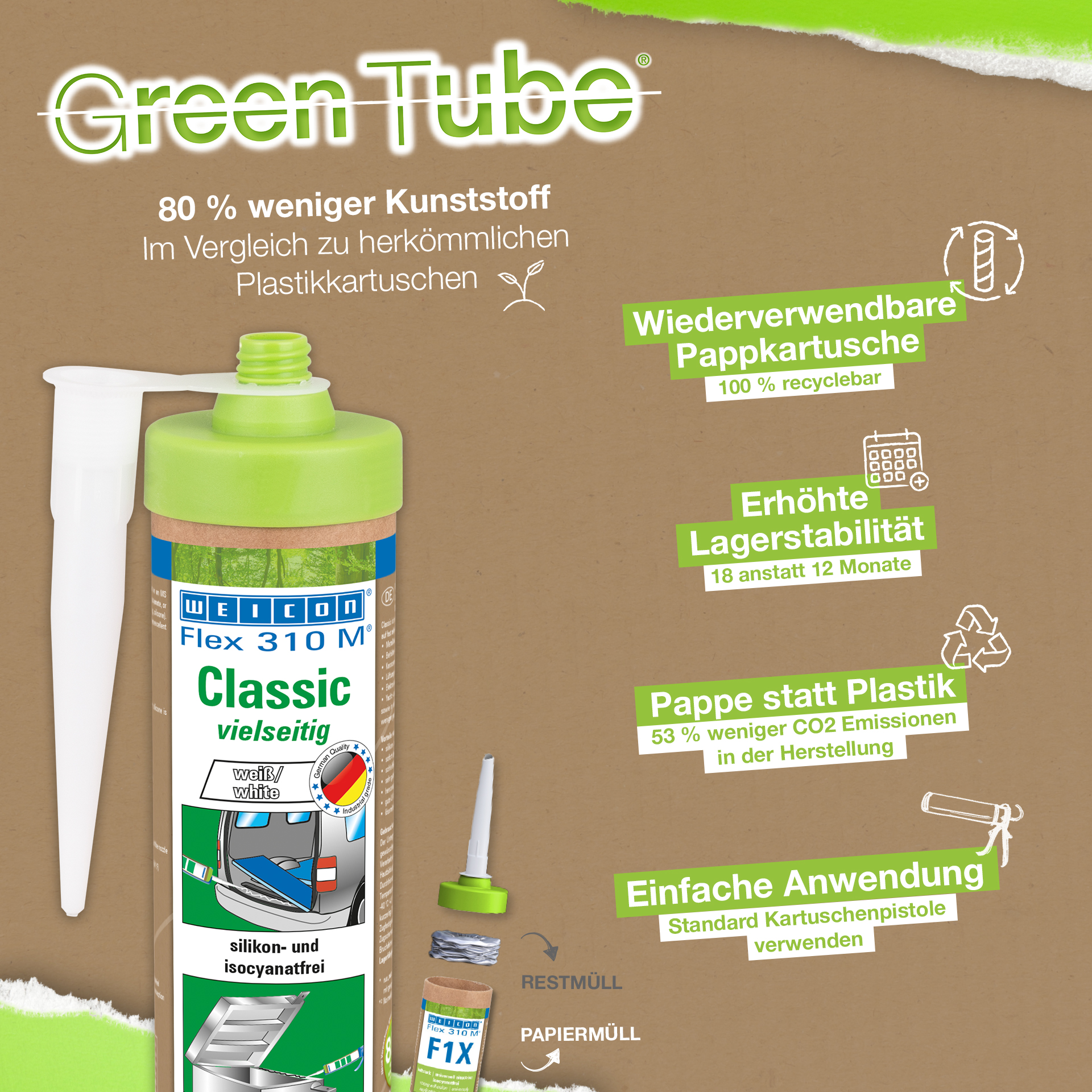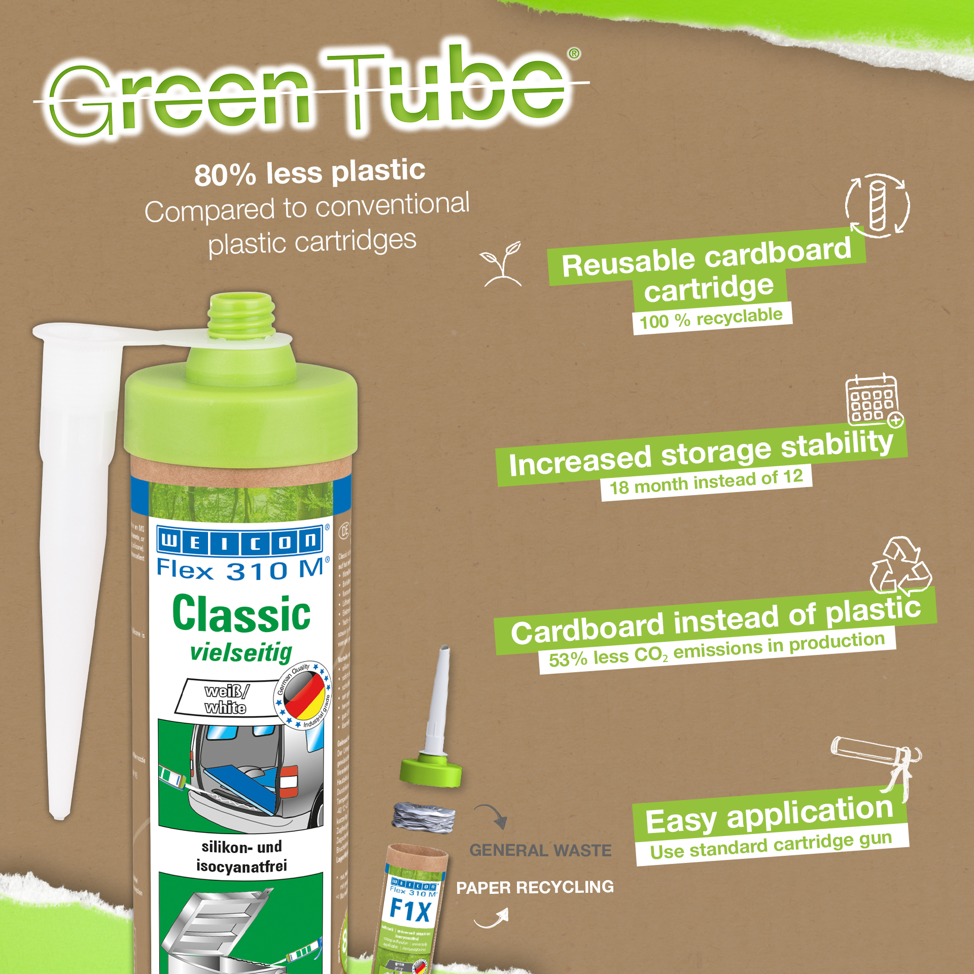 WEICON Flex 310 M® Classic é forte, pintável (molhado sobre molhado), lixável, tem uma excelente resistência ao envelhecimento e uma boa resistência aos raios UV. É resistente à água doce e salgada e é isento de silicone, isocianato, halogéneos e solventes. Flex 310 M® Classic é certificado pela ISEGA e pode ser utilizado como adesivo na tecnologia alimentar. O Flex 310 M® Classic é um adesivo elástico à base de polímero MS e é adequado para a colagem de metais, muitos plásticos, cerâmica, madeira, vidro e pedra. Flex 310 M® Classic pode ser utilizado nas construções metálicas, na construção de recipientes e aparelhos, na construção de máquinas e instalações, na indústria do mobiliário, em sistemas de ventilação e de ar condicionado, na indústria elétrica, na construção de iates e barcos, em mue sempre que a utilização de silicones ou produtos com silicone não é apropriada.