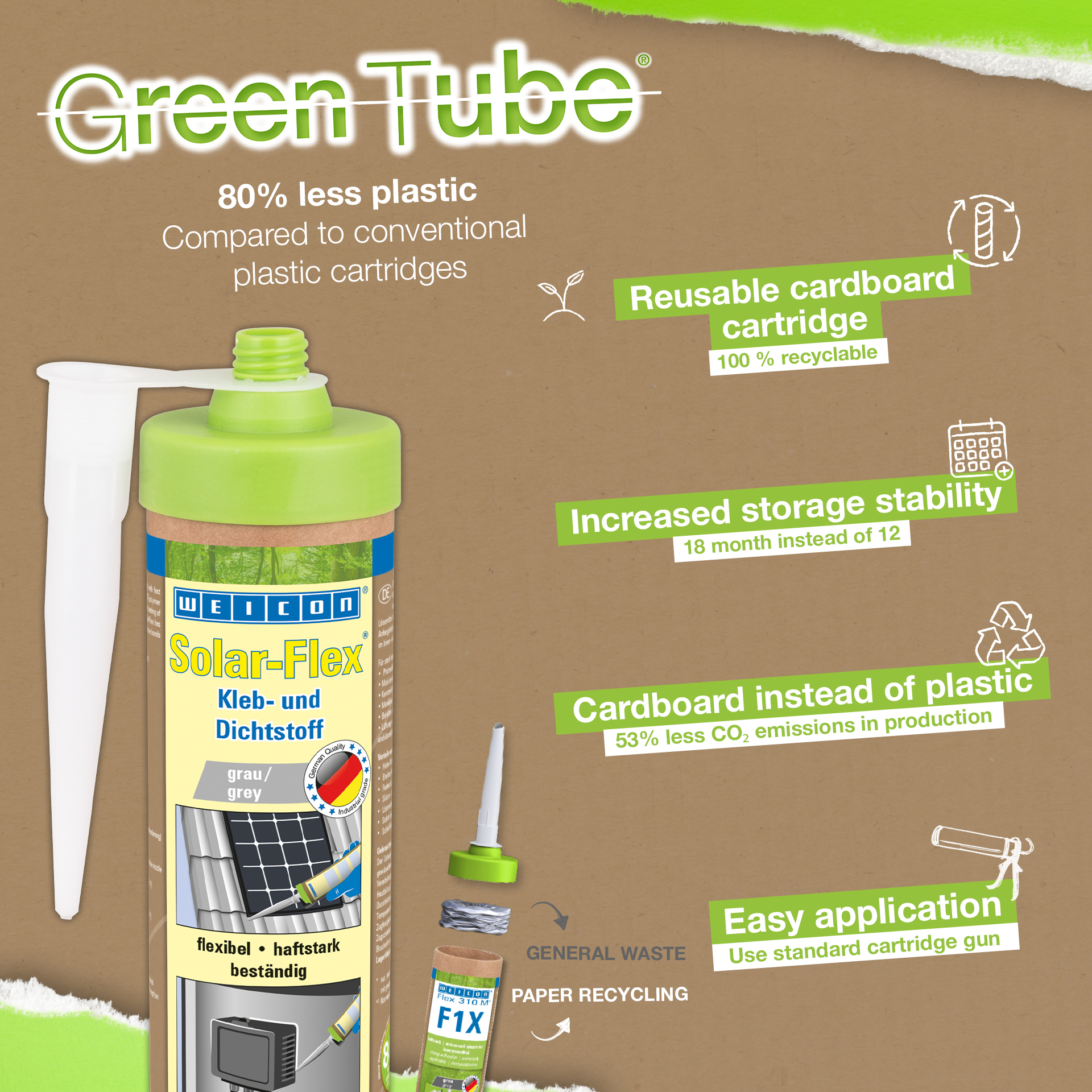 WEICON Solar-Flex® é forte, não corrosivo, pintável (molhado sobre molhado), resistente às intempéries e aos raios UV. Não contém silicone, isocianato, halogenados e solventes. Solar-Flex® é um adesivo elástico à base de polímero MS especialmente desenvolvido para a indústria solar. Tanto o poder de colagem inicial muito elevado como o rápido desenvolvimento da força adesiva permitem colagens mesmo em superfícies verticais. Substitui as fixações tradicionais na montagem de sistemas de energia solar e fotovoltaica.