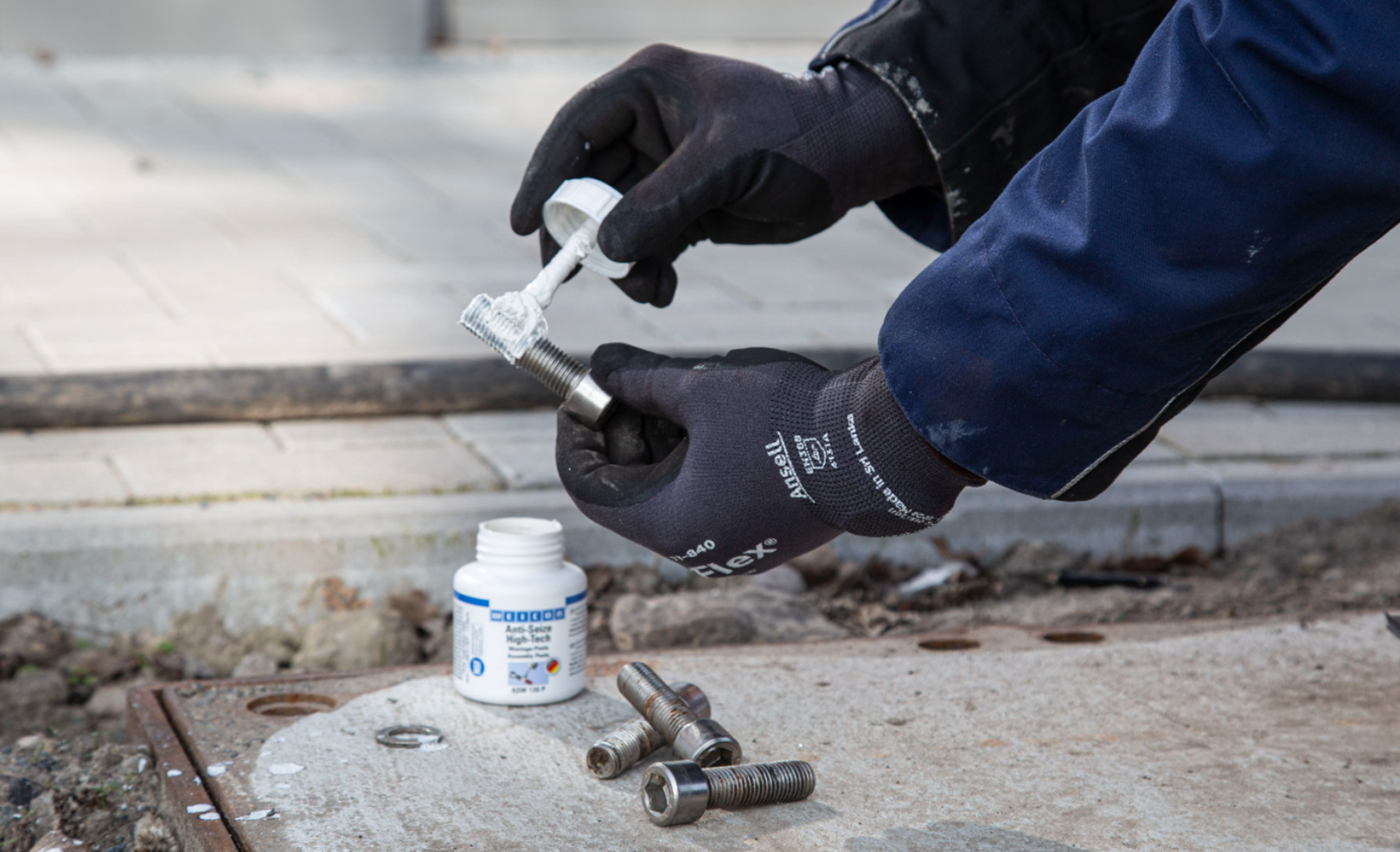 As pastas de montagem, pelo contrário, têm um elevado teor de lubrificante sólido - normalmente entre 30 e 50 por cento. Isto significa que estão equipados de forma ideal para temperaturas de funcionamento elevadas, cargas de pressão elevadas ou condições climatéricas exteriores permanentes. Protegem contra a oxidação, a corrosão, a corrosão por atrito, os efeitos de deslizamento e a "soldadura a frio". As pastas de montagem são utilizadas quando há pouco ou nenhum movimento, mas actuam forças muito elevadas. É por isso que eles são o lubrificante ideal para juntas de parafusos ou para prensar pinos e parafusos. Asseguram que as uniões roscadas "colam", mas que podem ser desmontadas em qualquer altura.