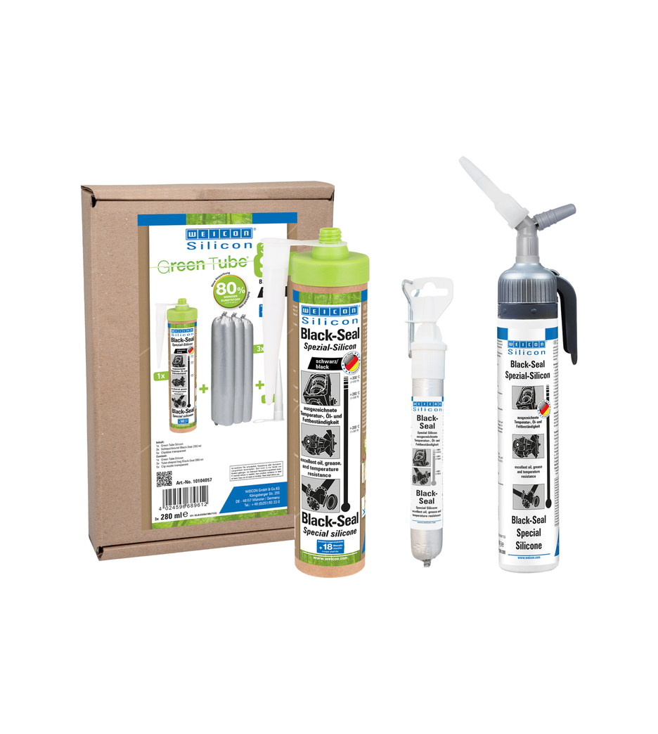 WEICON Black-Seal Preto é resistente a temperaturas elevadas (+280°C/+536°F), não contém solventes, apresenta aderência elevada, é resistente à pressão e ao envelhecimento e é extremamente elástico (alongamento até rutura de aprox. 500%). É adequado para colagem e vedação em aplicações onde é necessária uma resistência particularmente elevada a óleos e gorduras. O produto pode ser utilizado em caixas de velocidades, válvulas e tampas de carcaças, reservatórios de óleo, bombas de água, engrenagens e eixos, flanges, tanques e contentores, e em muitas outras áreas.