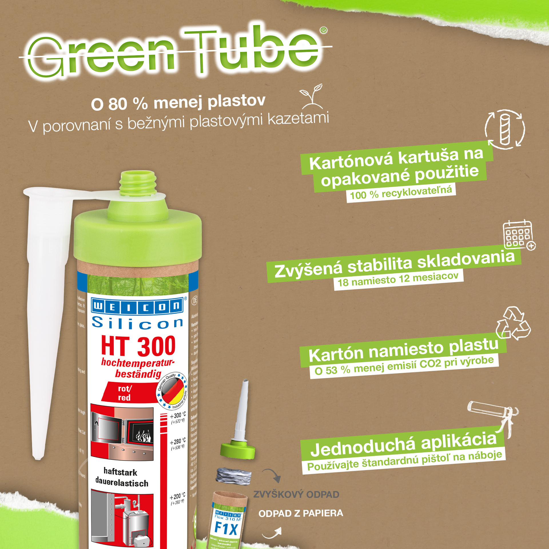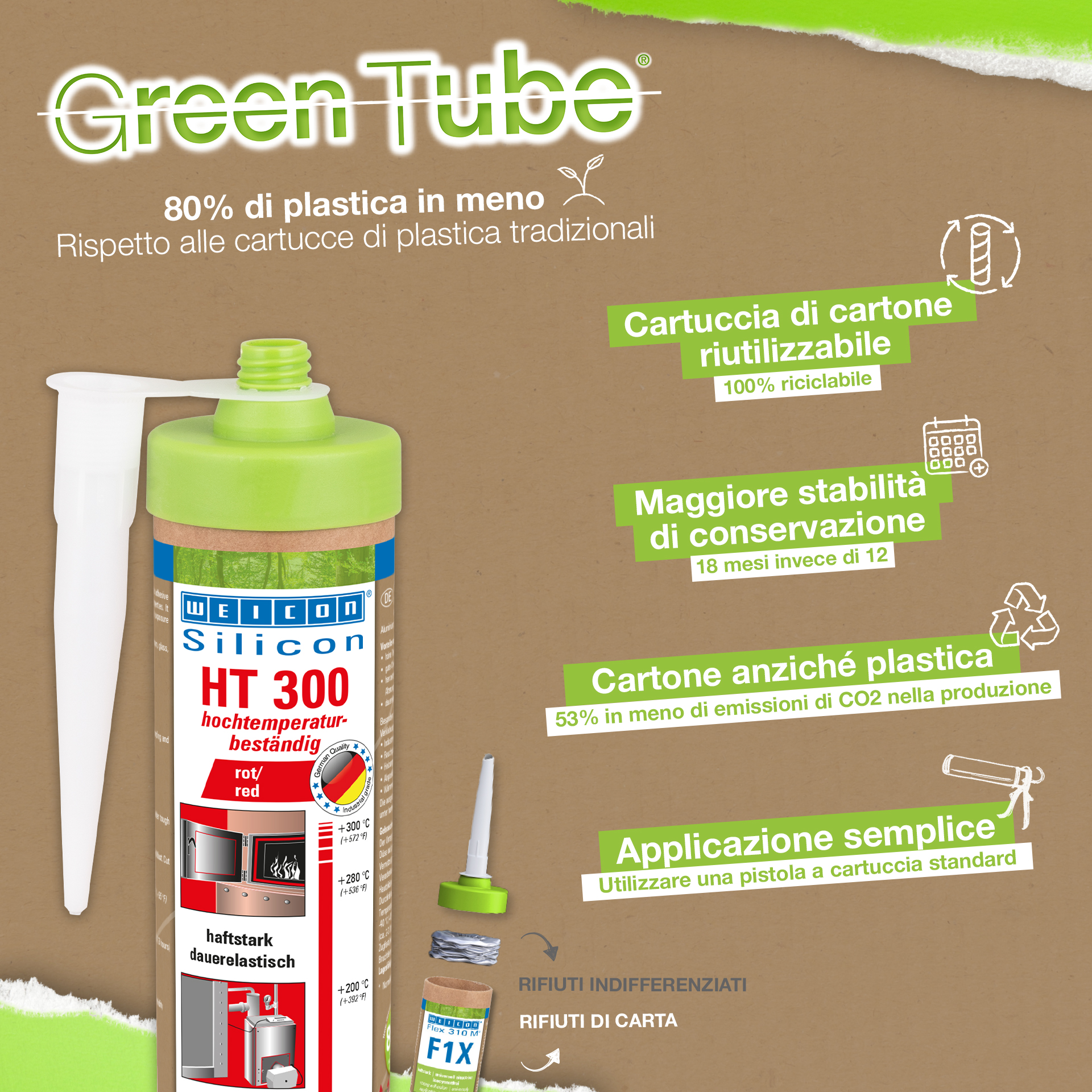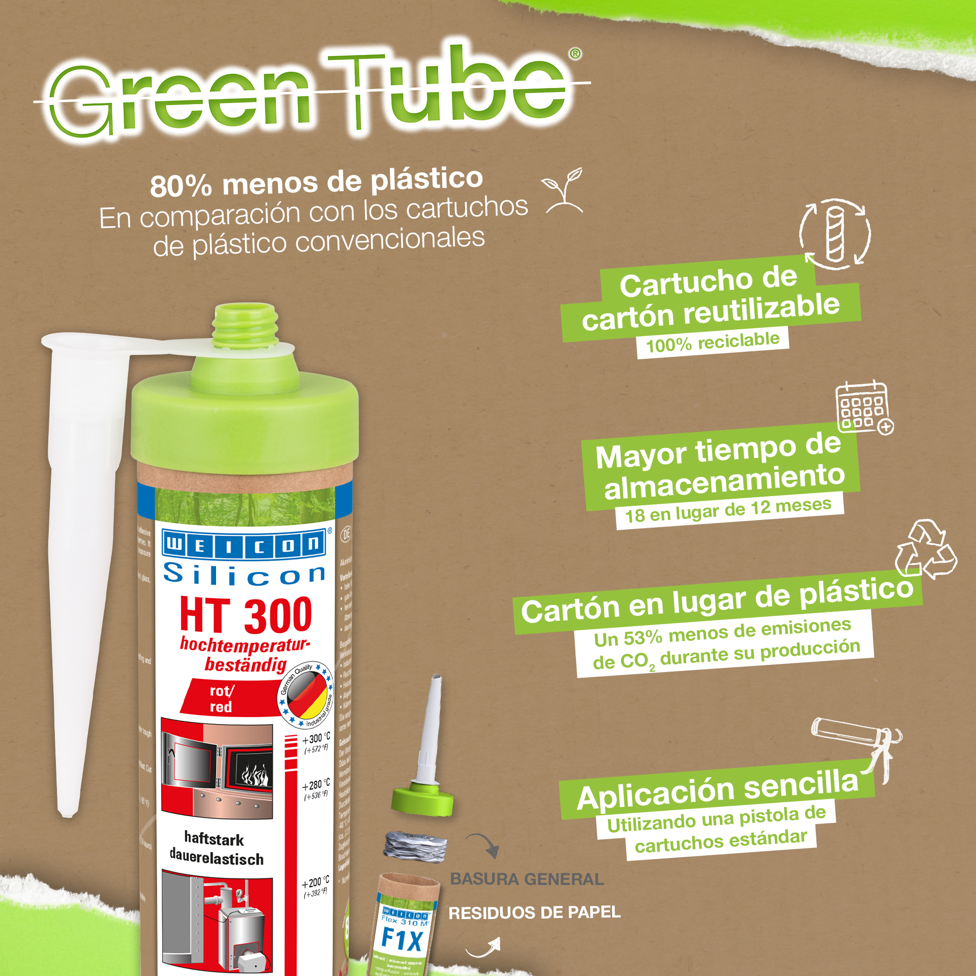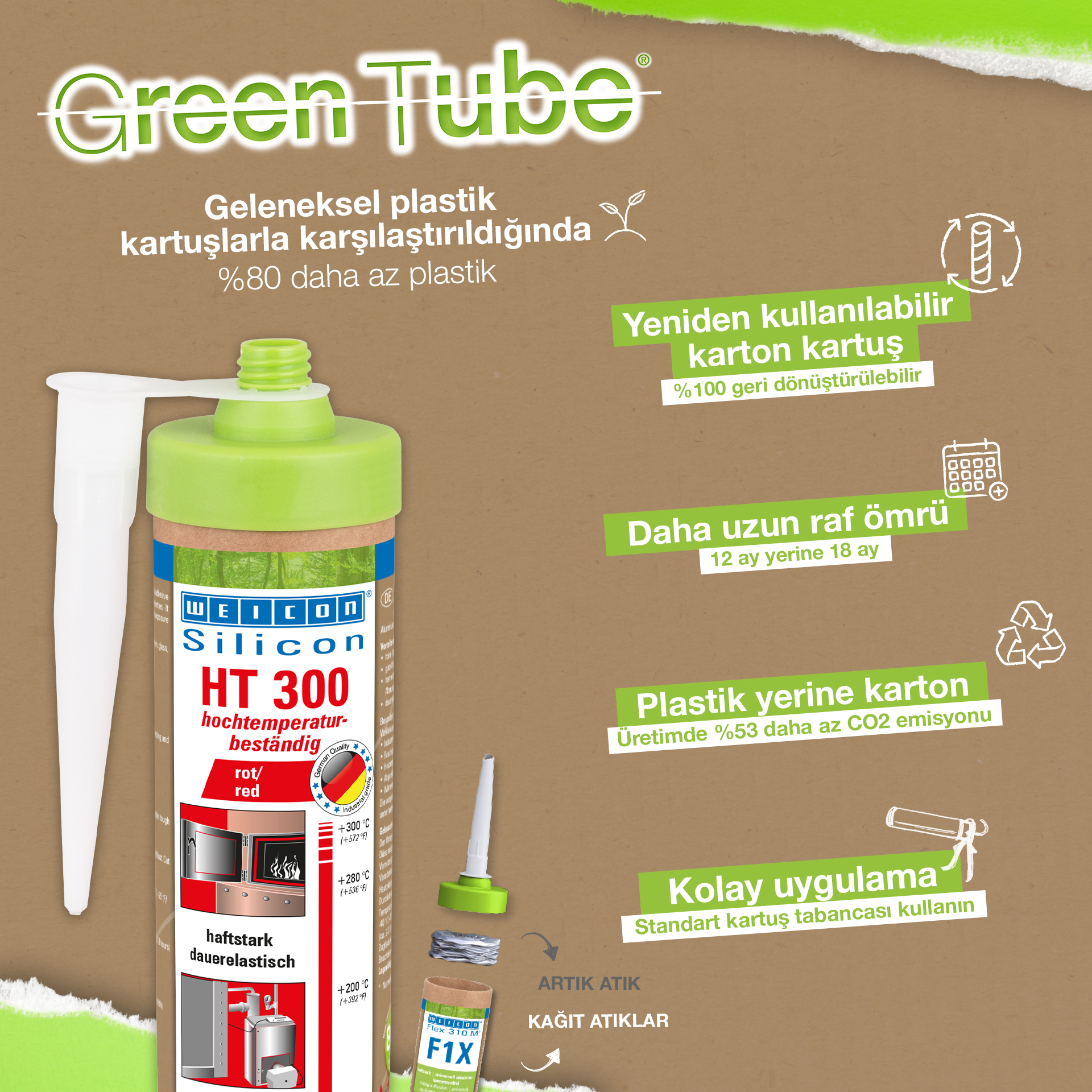 WEICON HT 300 é vermelho, resistente a altas temperaturas (+300°C/+572°F), isento de solventes, forte e de cura acética. É resistente às intempéries, ao envelhecimento e aos produtos químicos e é extremamente elástico (alongamento de rutura de cerca de 300%). O produto é particularmente adequado para colagens e vedações expostas ao calor e adere muito bem ao aço, alumínio, vidro, cerâmica e muitos outros materiais. O adesivo e o vedante podem ser utilizados em fornos industriais, sistemas de gases de combustão, instalações de aquecimento, encaminhamento de gases de escape, armários de aquecimento e em muitas outras áreas.