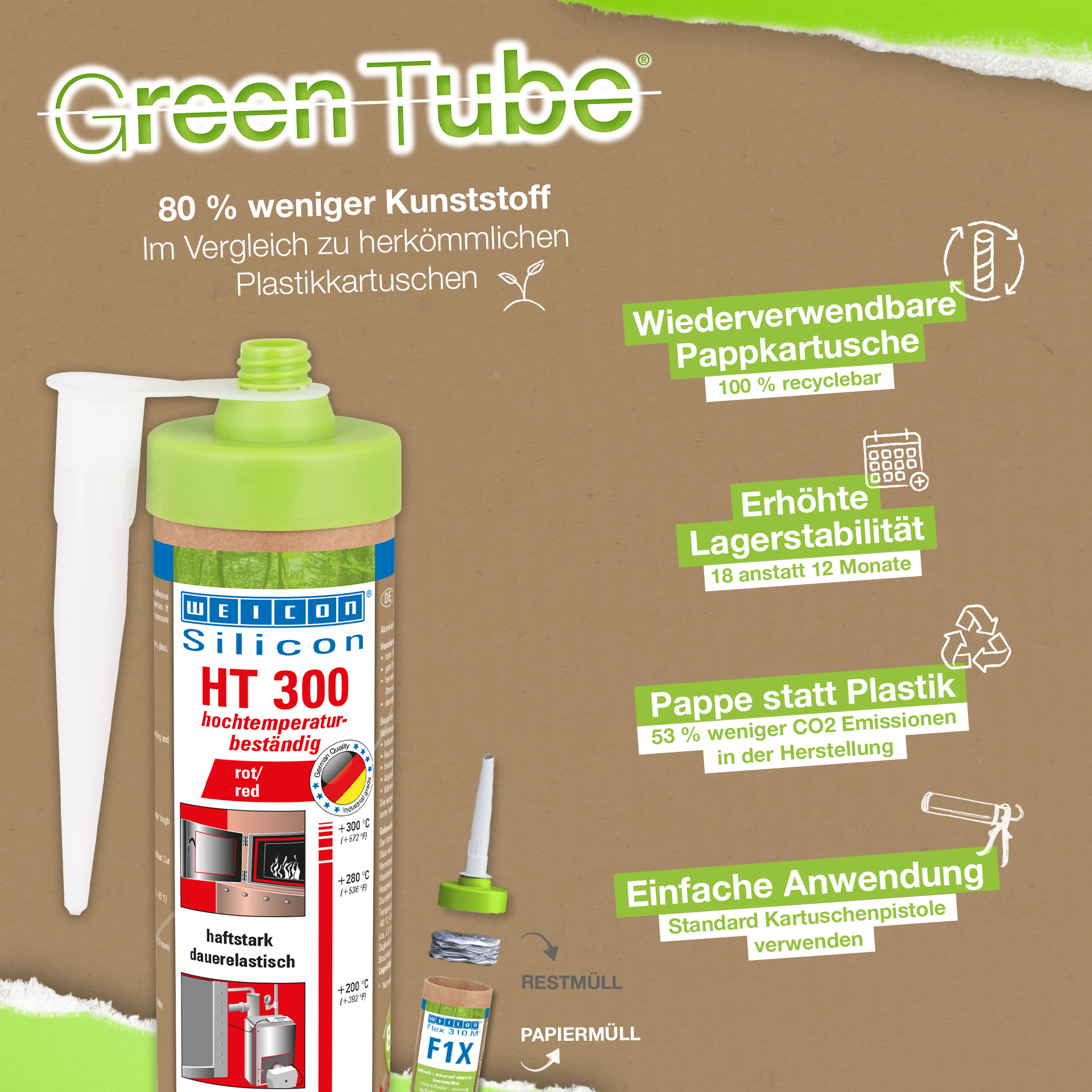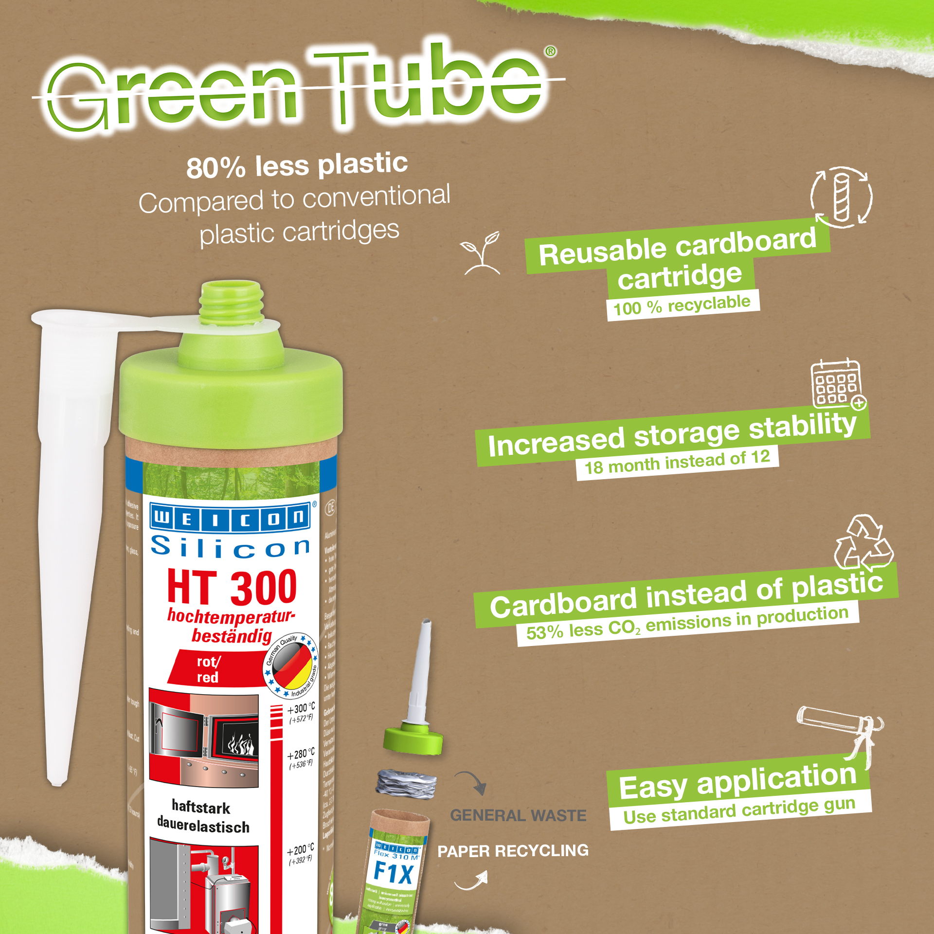 WEICON HT 300 é vermelho, resistente a altas temperaturas (+300°C/+572°F), isento de solventes, forte e de cura acética. É resistente às intempéries, ao envelhecimento e aos produtos químicos e é extremamente elástico (alongamento de rutura de cerca de 300%). O produto é particularmente adequado para colagens e vedações expostas ao calor e adere muito bem ao aço, alumínio, vidro, cerâmica e muitos outros materiais. O adesivo e o vedante podem ser utilizados em fornos industriais, sistemas de gases de combustão, instalações de aquecimento, encaminhamento de gases de escape, armários de aquecimento e em muitas outras áreas.