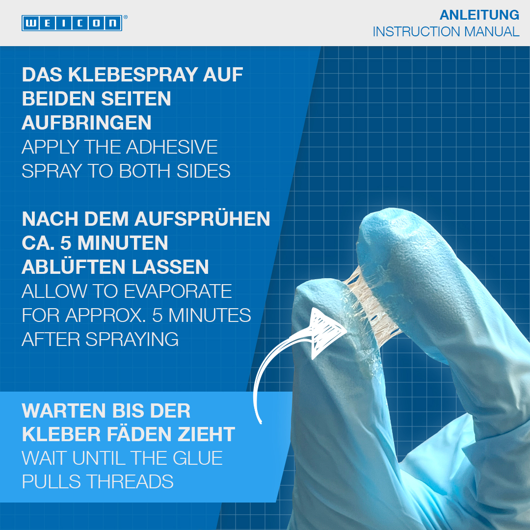 O Spray Adesivo Extra Forte WEICON é uma fórmula especial para colagens fortes e permanentes em superfícies rugosas e irregulares. Uma válvula de pulverização especial permite que o adesivo seja aplicado numa área de superfície ampla e oferece a possibilidade de ajustar o alinhamento de forma flexível em 360°. O Spray Adesivo Extra Forte pode ser utilizado para a colagem de feltro, folha de PVC, imitação de couro, tapetes, plásticos, cartão, espuma e borracha celular, materiais isolantes, espuma macia, vinil, couro, borracha, metal e madeira. Também é adequado para a colagem de grandes superfícies.