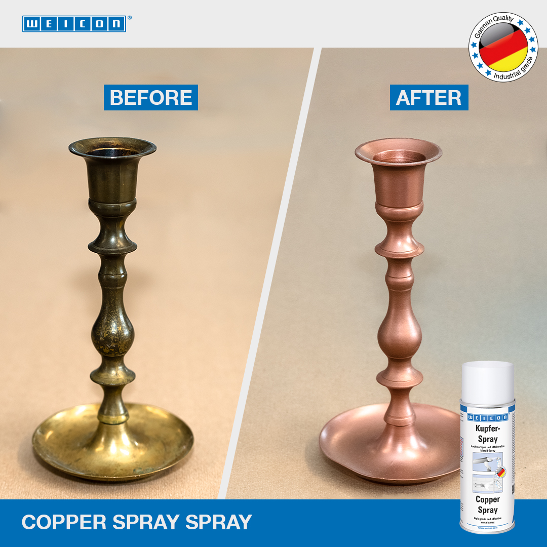 O Spray de Cobre WEICON é um spray metálico de alta qualidade, resistente às intempéries, com elevada aderência e um elevado teor de cobre para revestimentos protetores e decorativos com um atraente carácter de metal não ferroso para utilização em interiores e exteriores. É também utilizado para o melhoramento visual (revestimento de cobre) de várias superfícies de materiais ou peças de design. O Spray de Cobre pode ser utilizado em soleiras de janelas, caleiras e algerozes, luzes exteriores e caixas de correio, bem como em trabalhos artísticos e decorativos.