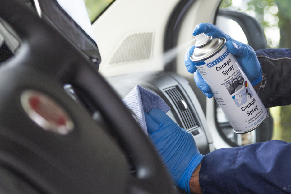 O Spray de Cockpit WEICON é um produto de tratamento repelente de água para todas as peças de plástico e borracha, bem como para superfícies de madeira envernizada no interior de veículos automóveis. A película protetora permanente e invisível evita a contaminação e cria um brilho sedoso, fácil de cuidar e resistente a poeiras. O Spray de Cockpit refresca os plásticos baços e desgastados pelo tempo. A borracha não racha e mantém-se flexível e elástica. O Spray de Cockpit WEICON elimina rangidos e chiadeiras conservando os painéis de instrumentos, os revestimentos interiores, todas as peças de plástico e de borracha, o couro, a madeira e os cromados, bem como os tetos dos automóveis revestidos em couro sintético. Evita o congelamento dos vedantes das portas, janelas e porta-bagagens e é utilizado como lubrificante para cintos de segurança, guias dos bancos, tetos de abrir, guias das janelas, fechaduras das portas e em todos os locais onde as massas lubrificantes possam causar sujidade.