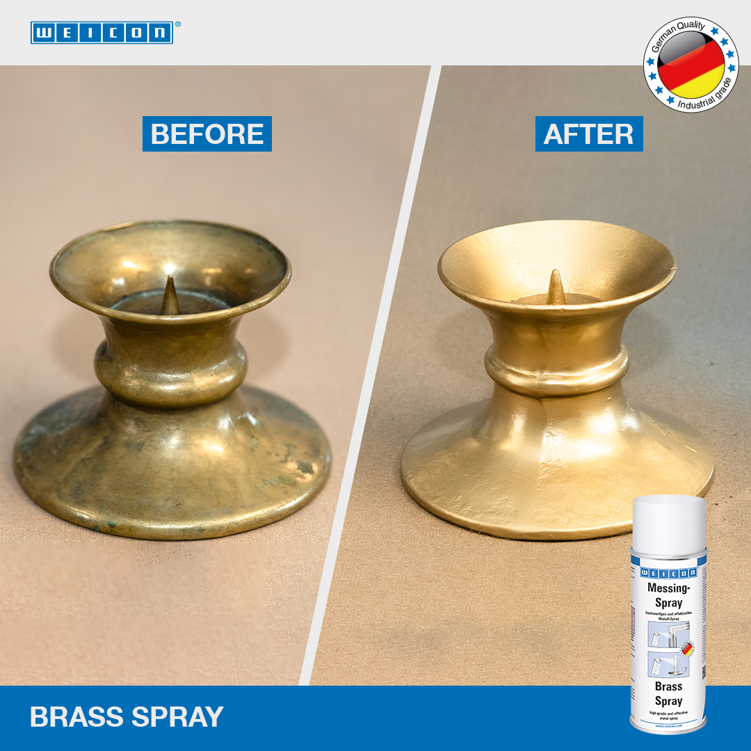 O Spray de Latão WEICON é um revestimento metálico com um elevado teor de latão e uma tonalidade de cor típica do latão. Para a proteção e o embelezamento de diversos materiais. O Spray de Latão WEICON pode ser utilizado em trabalhos de restauro, para fins decorativos, em artes e ofícios, hobbies e aplicações de bricolage. É adequado para a reparação duradoura de peças cromadas amarelas que tenham sido danificadas por perfuração, soldadura ou fresagem.