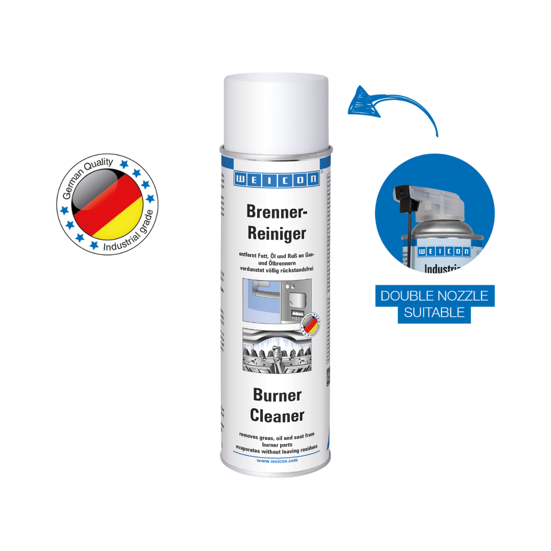 O Spray de Limpeza de Queimadores WEICON é um produto de limpeza especial para a remoção de gordura, óleo, ferrugem e outras impurezas das peças do queimador. O Spray de Limpeza de Queimadores WEICON evapora sem deixar resíduos. O Spray de Limpeza de Queimadores WEICON pode ser utilizado nas ligações de jato, placas deflectoras, rodas do ventilador e no interior da caixa, eléctrodos de ignição, etc.