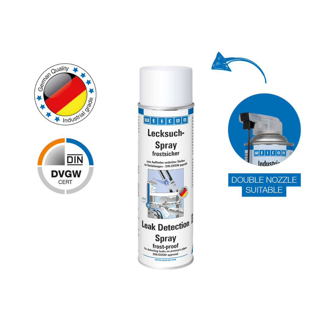 A forma segura, fácil e rápida de detectar fugas ou pontos porosos em tubagens de gás e sistemas de refrigeração e ar condicionado. O Spray Detetor de Fugas Anti Congelante não forma compostos nocivos com estes gases: dióxido de carbono (CO2), propano, butano, acetileno, oxigénio, carvão e gás natural, azoto, monóxido de dinitrogénio (N2O) e CFC. Não é inflamável. Spray Detetor de Fugas Anti Congelante é adequado sempre que se utiliza ar comprimido ou substâncias gasosas. Este spray pode ser utilizado, por exemplo, em tubos, mangueiras, acessórios, ligações soldadas, aparafusadas e soldadas, acessórios, válvulas, conectores e adaptadores.