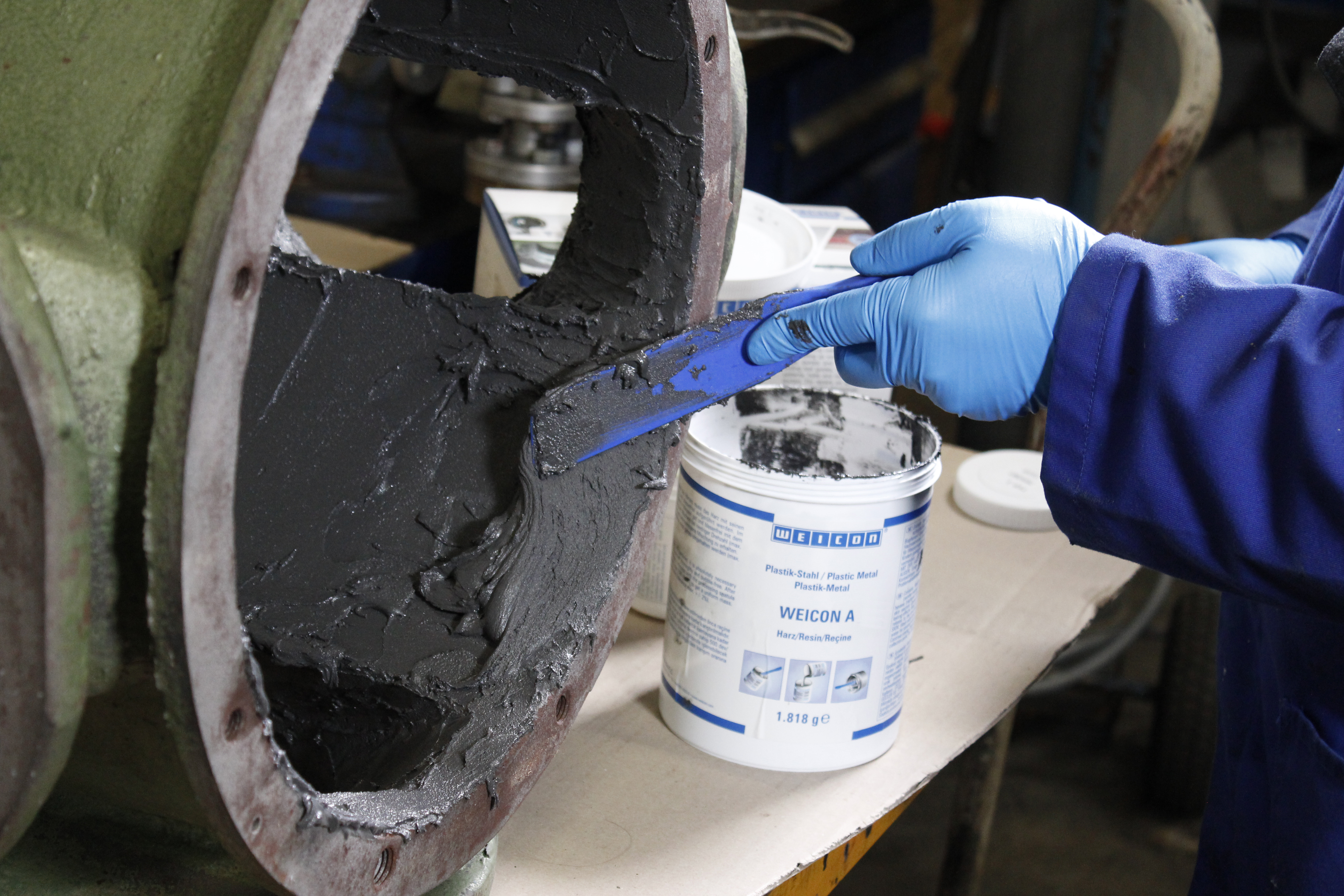O Plástico Metálico WEICON A possui certificado DNV GL e é particularmente adequado para trabalhos de reparação na indústria naval. O sistema de resina epóxi tem uma carga elevada de pigmentos de aço, magnético e a sua textura pastosa permite a aplicação mesmo em superfícies verticais. Pode ser utilizado para a remoção de danos de corrosão e corrosão alveolar em tanques, reparações em tubos e peças fundidas. Por exemplo, pode ser utilizado para reproduzir componentes de aço pesados que apresentem danos severos por corrosão. Neste caso, o WEICON A oferece uma alternativa real à soldadura, pois a aplicação da resina epóxi não causa distorção térmica como na soldadura. O sistema de 2 componentes pode ser utilizado para a reparação em tanques e tubos, bem como para a reparação de ranhuras em carcaças de motores ou bombas e peças de máquinas. É ideal para a utilização em sistemas de esgotos onde os tubos são expostos a fortes influências de corrosão. Outras aplicações incluem o fabrico de modelos, moldes, ferramentas e dispositivos de fixação. O sistema de resina epóxi WEICON A pode ser utilizado na construção de máquinas, na construção de ferramentas, no modelismo e na construção de moldes, bem como em diversas áreas da indústria.