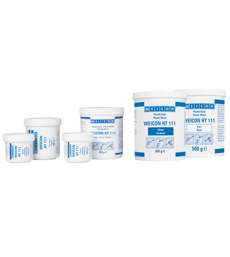 O sistema de resina epóxi WEICON HT 111 é adequado para reparações e retoques em peças metálicas. É pastosa, com carga de aço e resistente a temperaturas elevadas até +200°C (+392°F) (temporariamente até +280°C/+536°F). WEICON HT 111 é resistente a produtos químicos, não é corrosivo e é processado com numa relação de mistura de 1:1. O sistema de resina epóxi também é adequado para o processamento em superfícies verticais e pode ser utilizado em reparações e colagens em peças fundidas e metálicas, no enchimento de cavidades, no retoque de danos em recipientes, carroçarias e peças de máquinas e para vedar bombas e tubos. Devido às suas propriedades, este material composto é particularmente adequado em aplicações de engenharia mecânica e instalação, engenharia de aparelhos, bem como em muitas outras áreas da indústria.