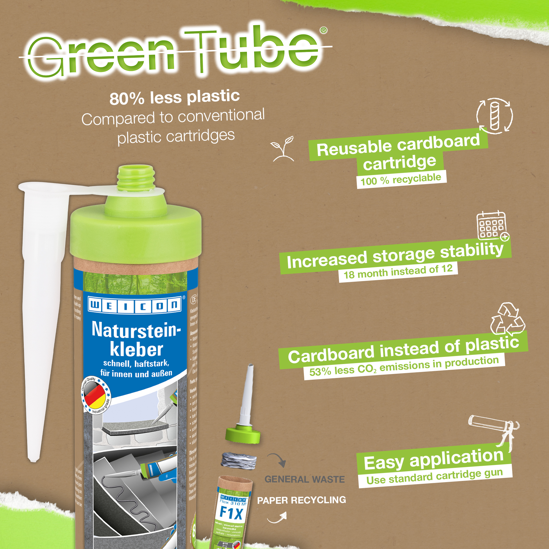 O WEICON Polímero MS Adesivo para Pedra Natural é um adesivo forte para fixação de pedra natural, pedra e cerâmicas. Graças à sua elevadíssima adesão inicial e à sua rápida força de adesão, a colagem é possível mesmo em superfícies verticais, como por exemplo, em paredes. O adesivo para pedra é adequado para muitas aplicações em ambientes interiores e exteriores. É à prova de gelo, tem uma resistência a altas temperaturas temperatura de -40°C a +90°C, bem como uma elevada resistência às intempéries e aos raios UV. O Adesivo para Pedra Natural endurece rapidamente e tem uma resistência final muito elevada. Após a cura, o adesivo pode pode ser lixado manténdo-se elástico para compensar os movimentos. O adesivo para pedra é isento de silicone, isento de isocianatos, isento de halogéneos Pode ser utilizado numa grande variedade de aplicações, por exemplo, para para colar parapeitos de janelas, azulejos, rodapés, molduras decorativas ou degraus de escadas. O Polímero MS Adesivo para Pedra Natural adere muito bem a uma grande variedade de materiais, tais como madeira, materiais à base de madeira, plásticos, metais, vidro e substratos minerais. Está disponível em cinzento e branco.